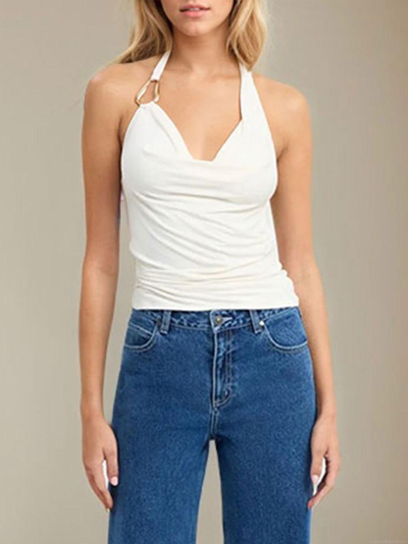 • Women's Sexy Halter Tank Top Viscose Spandex Knit Sleeveless Draped Neck Backless Slim Fit Top With Metal Ring Detail For Summer Party Daily Wear