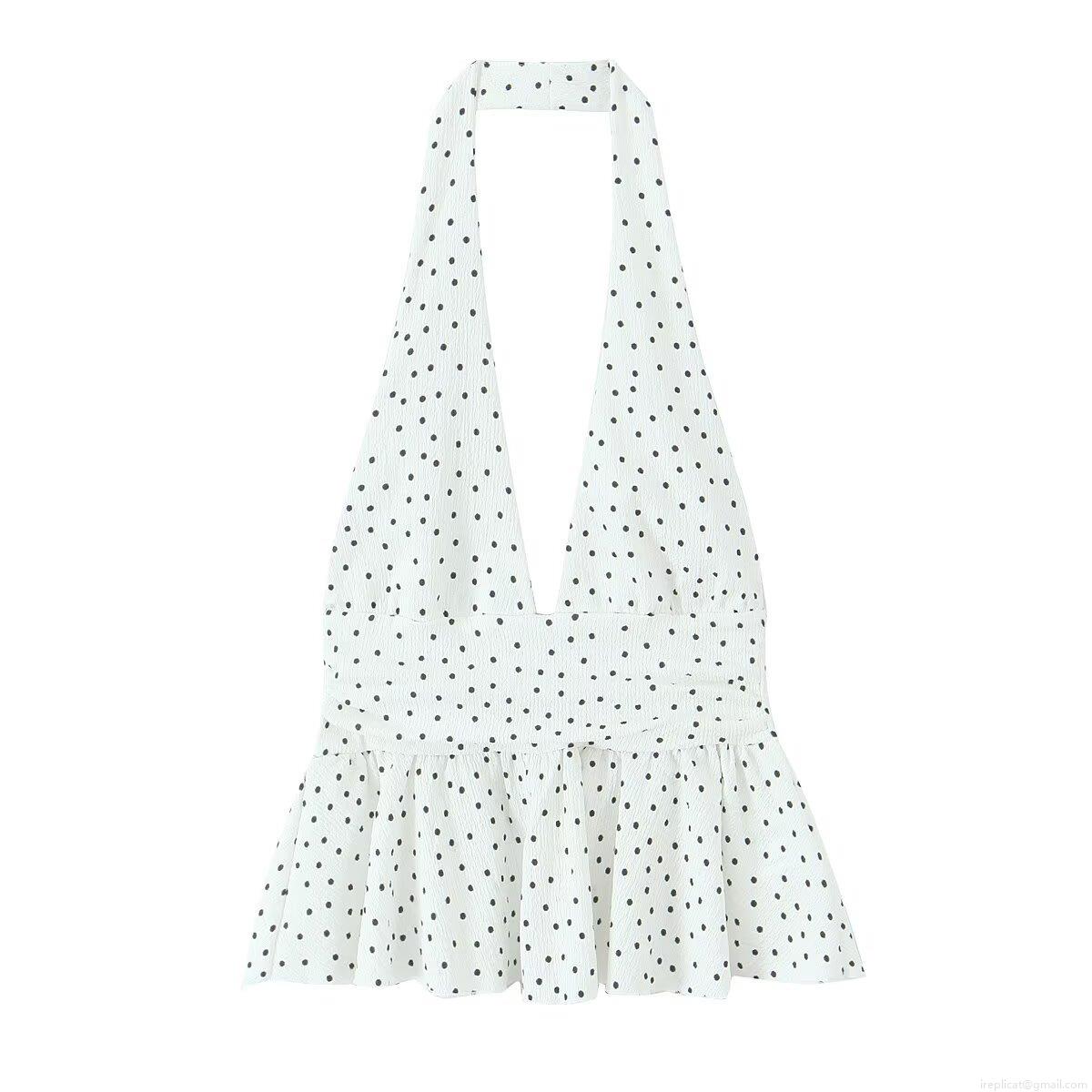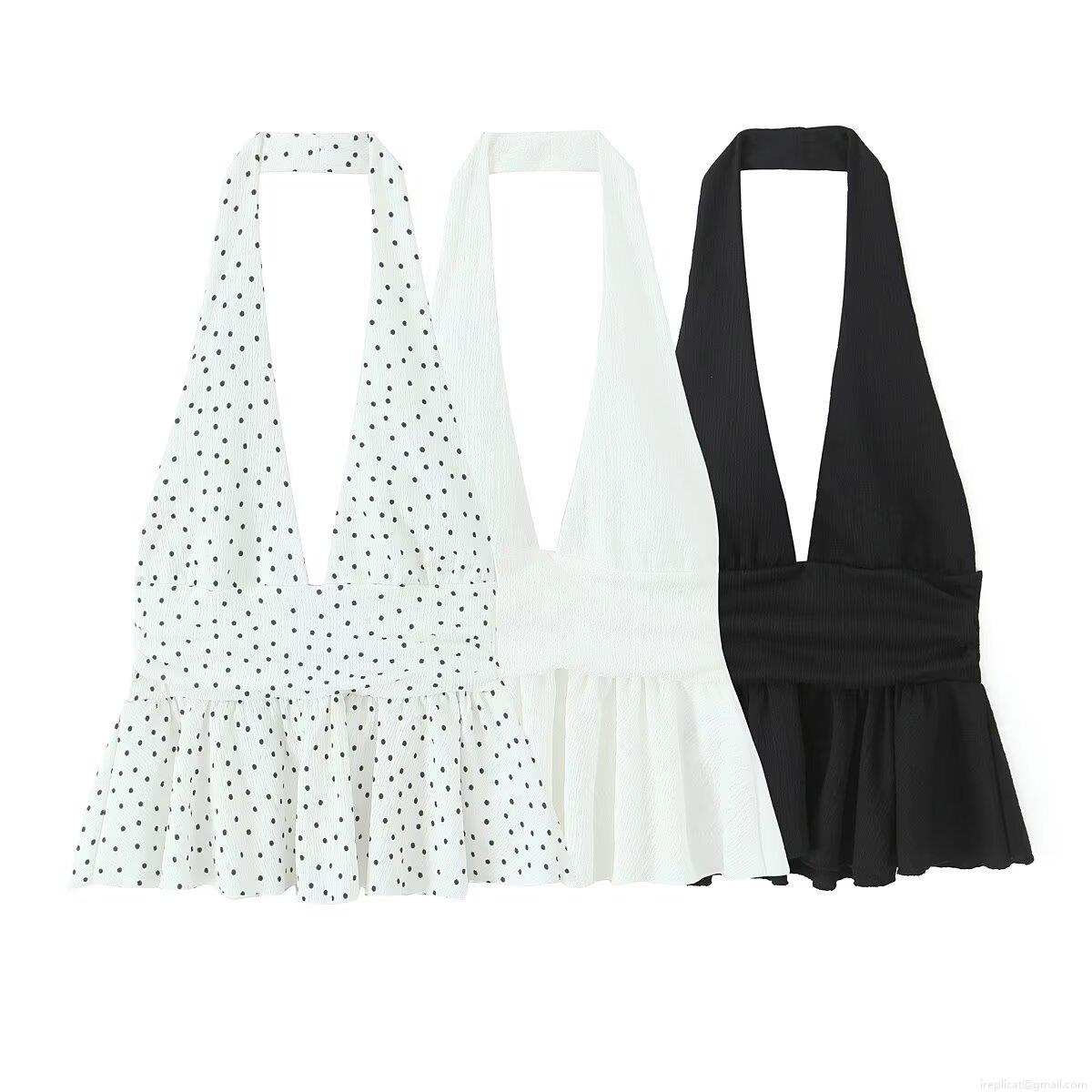 • Women's Sexy Halter V-Neck Backless Crop Top With Ruffle Hem Smocked Waist Polyester Crepe Textured Sleeveless Blouse Polka Dot Black White Summer Streetwear