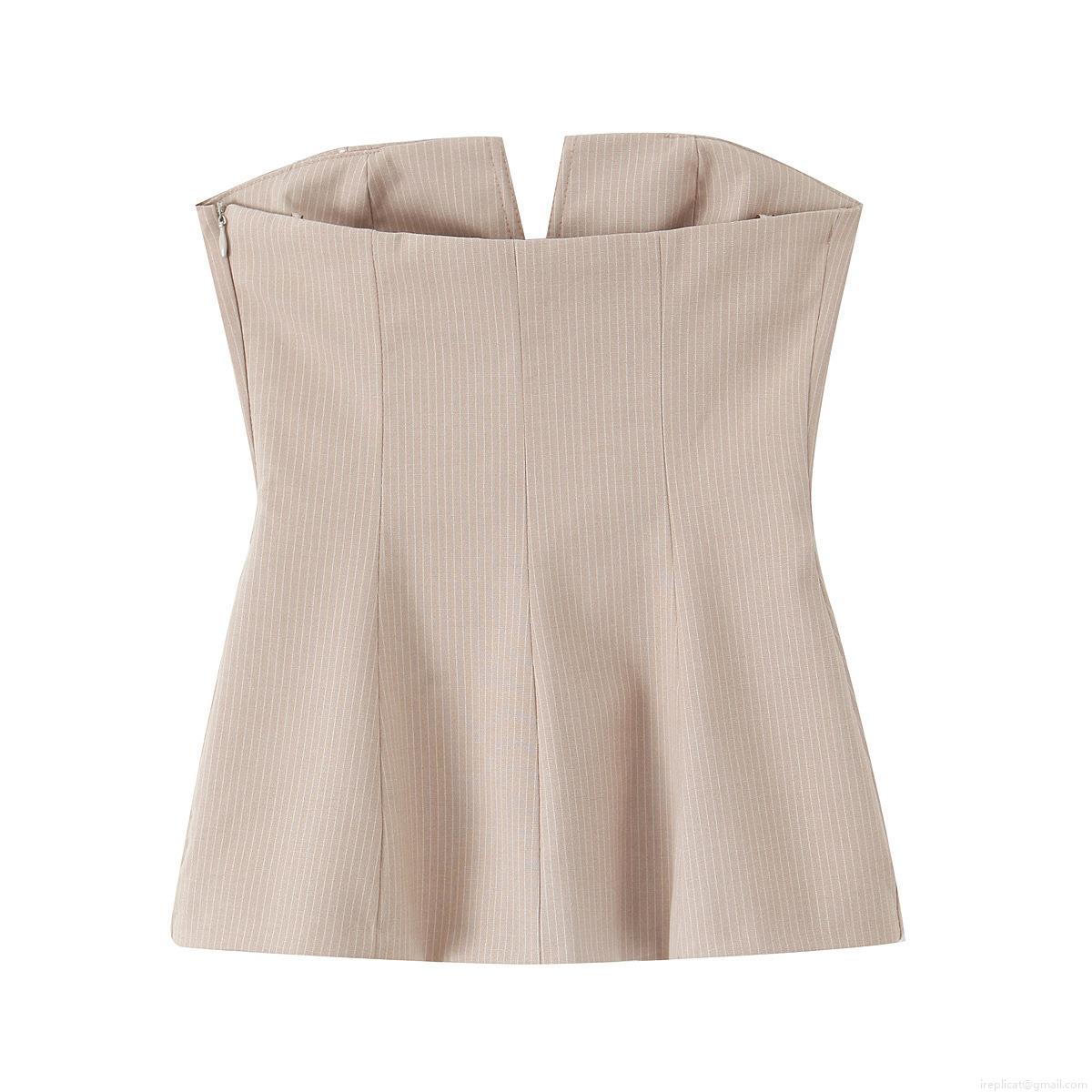 • Women's Sexy Khaki White Striped Bandeau Top Strapless V-Neck Off Shoulder Peplum Vest Slim Fit Polyester Clubwear Crop Top for Ladies
