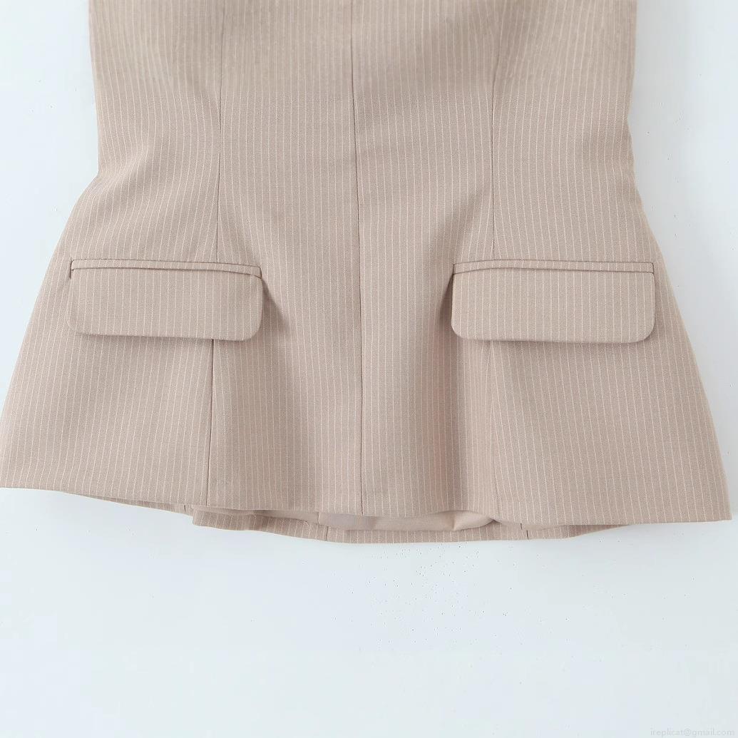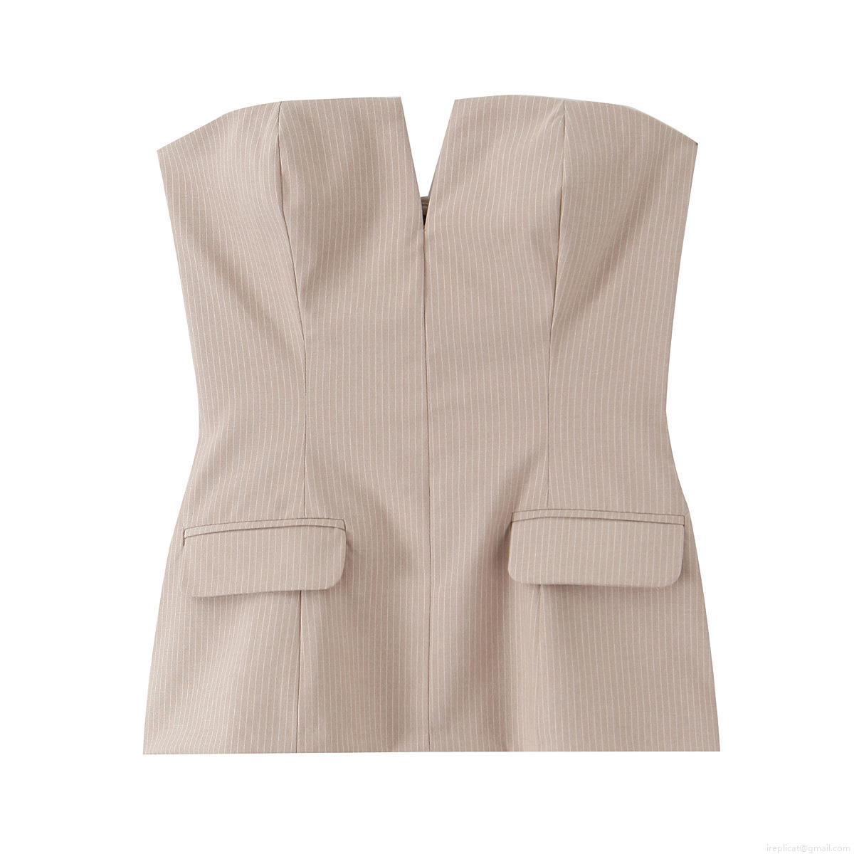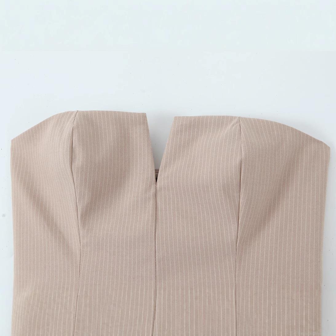 Vertical Stripes, Strapless Design, Peplum Hem, V-shaped Incision, Decorative Pocket Flap
