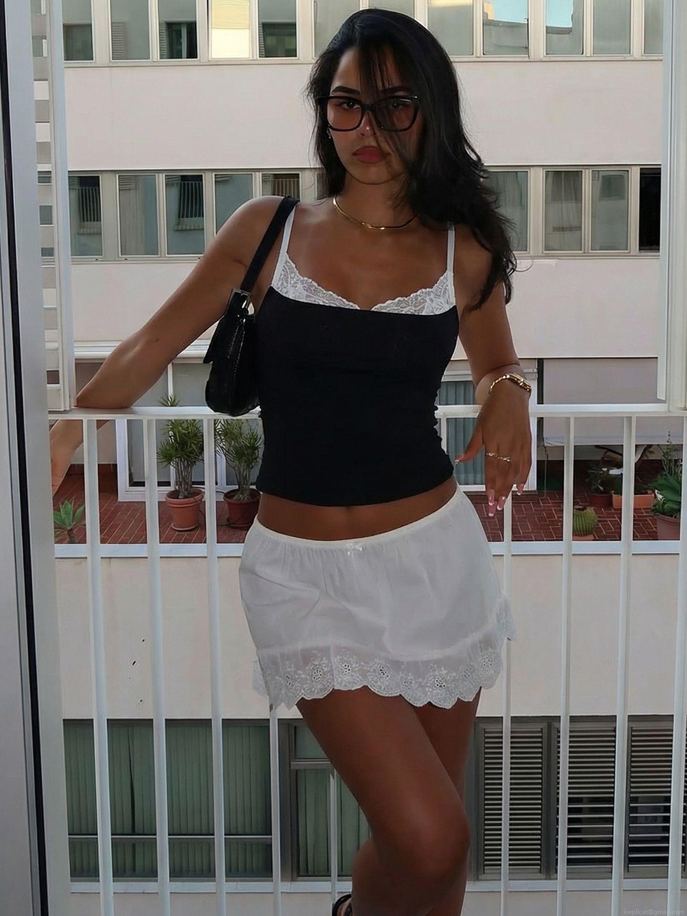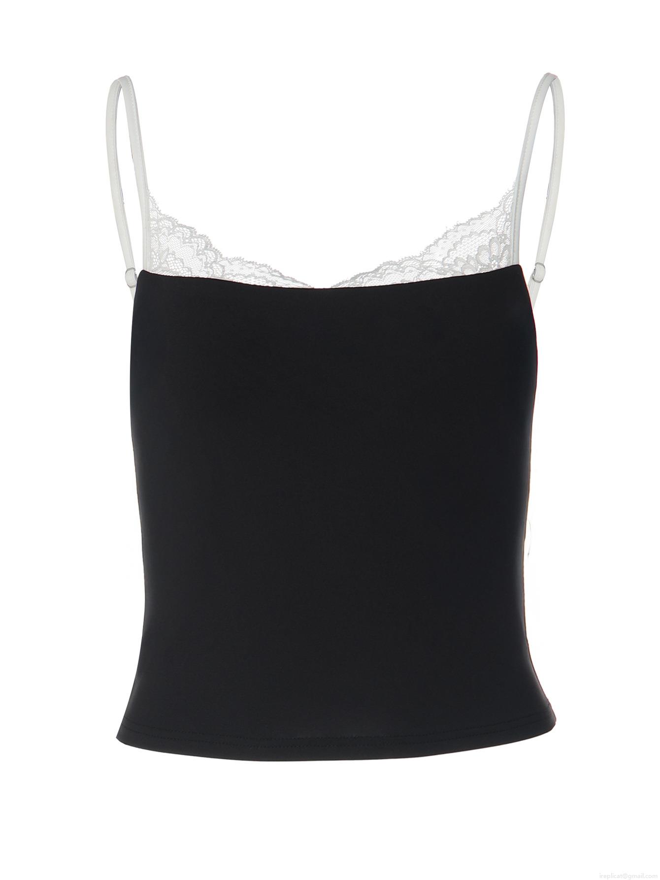 • Women's Sexy Lace Trim Camisole Top Slim Fit Sleeveless V-Neck Cropped Tank Top Summer Streetwear Spicy Girl Style Black Polyester Spandex Patchwork Top
