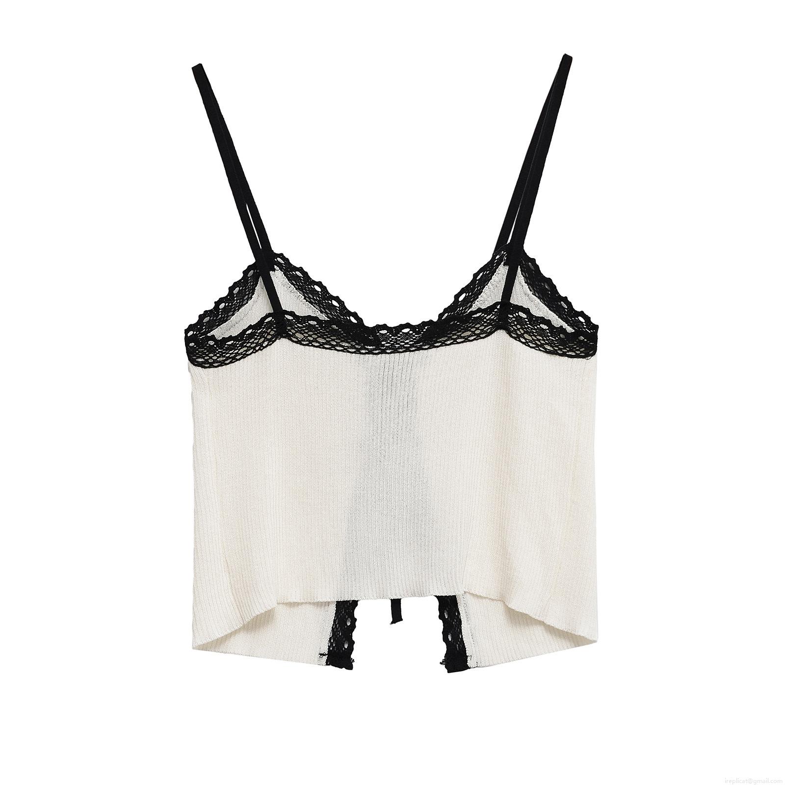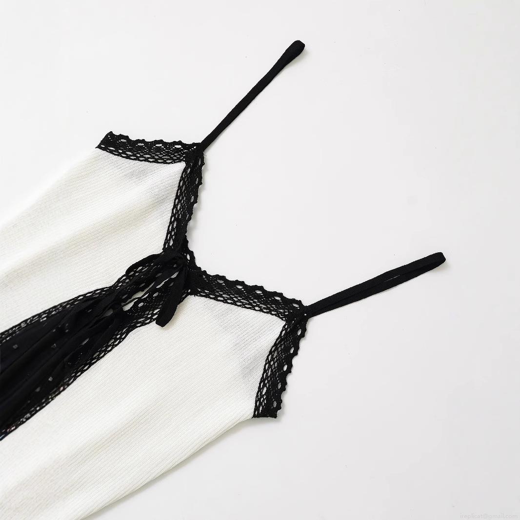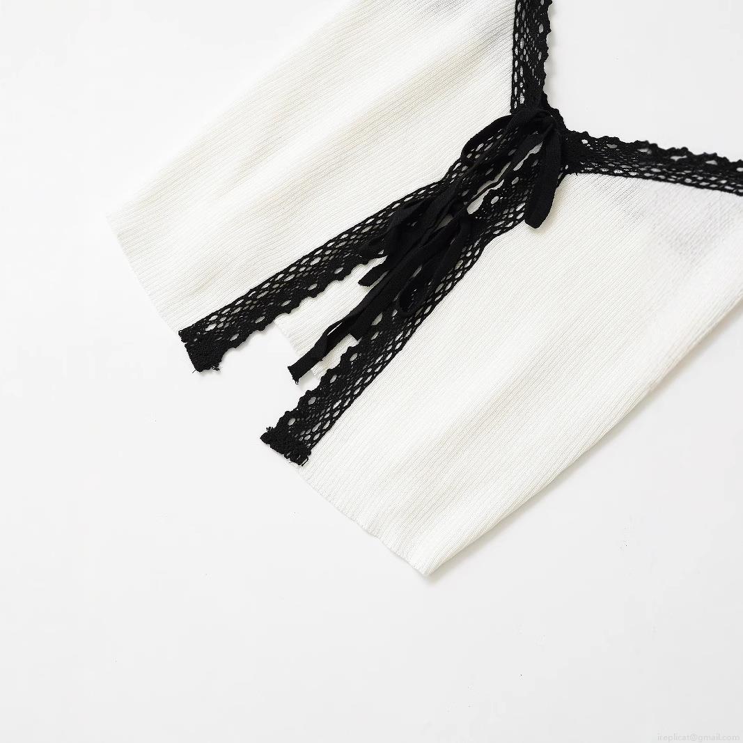 Women's Sexy Lace Trim Mercerized Cotton Camisole V Neck Contrast Color Ribbed Knit Tank Top With Bow Tie For Summer Dating Ladies Breathable Top