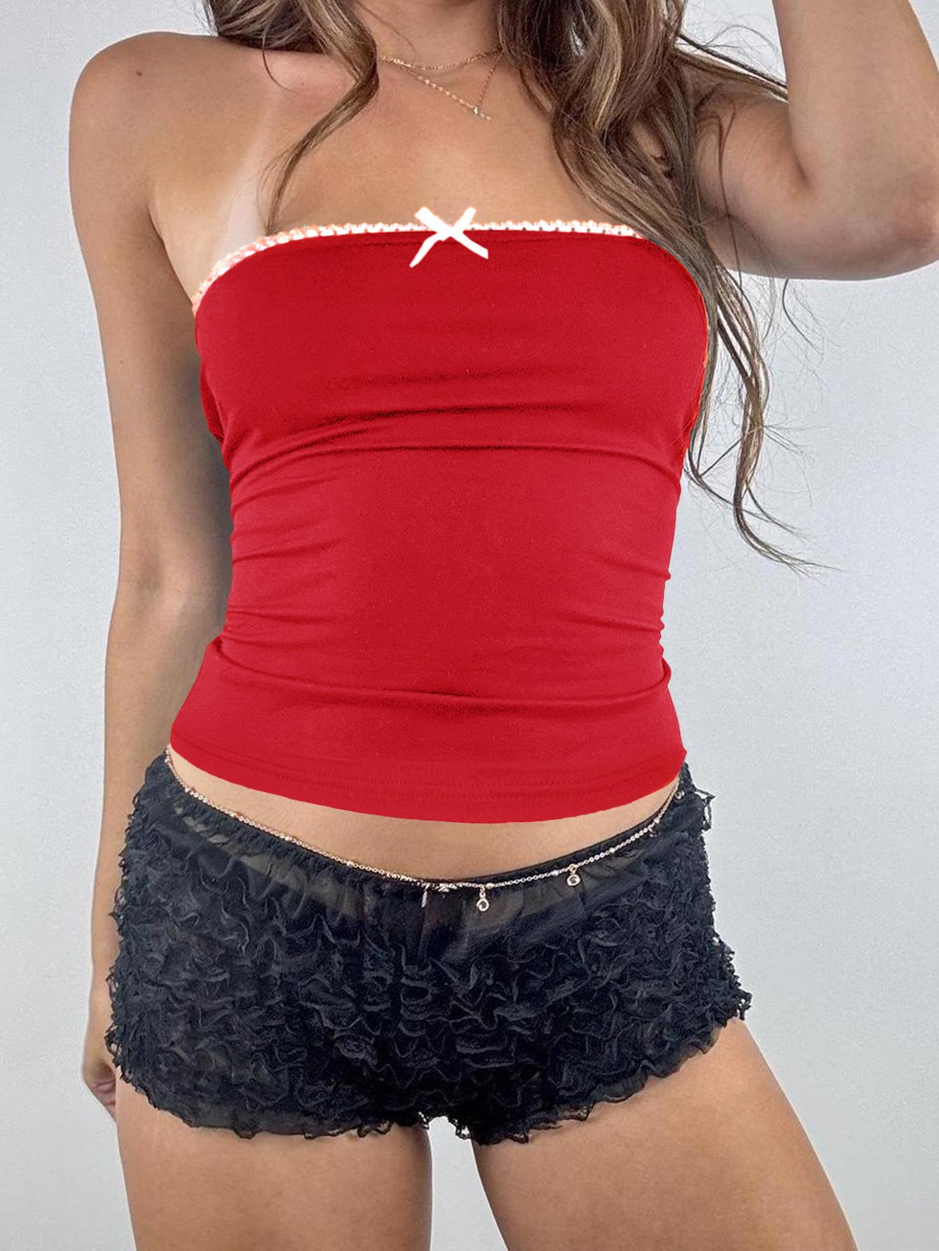 • Women's Sexy Lace Trim Tube Top Y2K Solid Color Strapless Bow Decor Crop Tank Top Summer Slim Fit Camisole Vest For Club Party Daily Streetwear