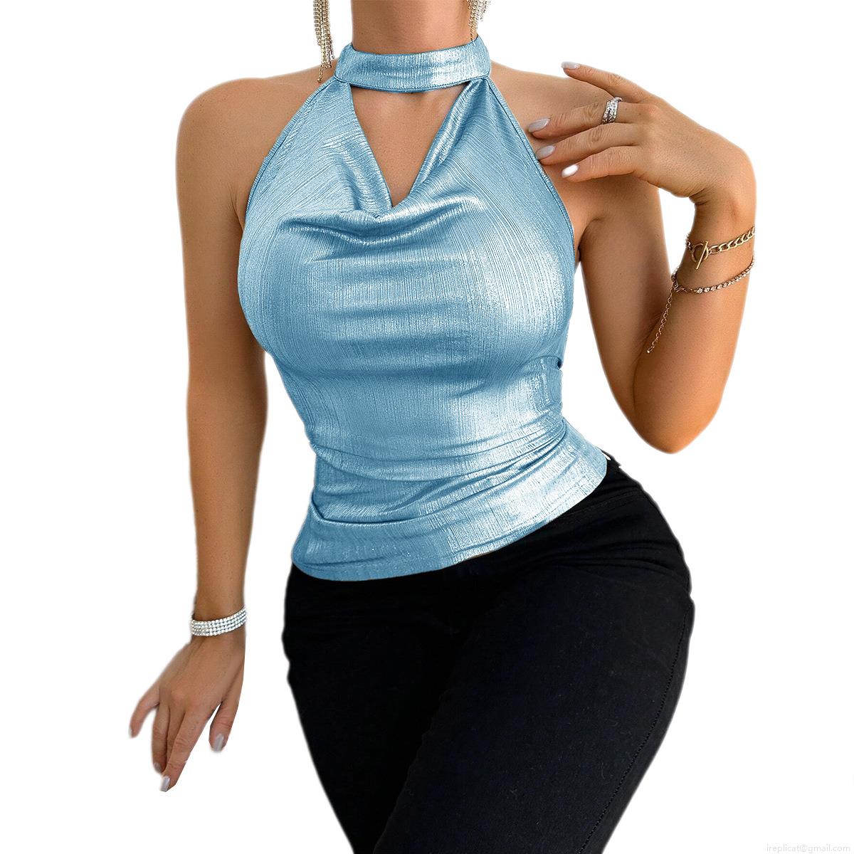 • Women's Sexy Metallic Blue Halter Neck Tank Top Backless Shirring Club Party Sleeveless Crop Top Polyester Spandex Blend Shiny Top
