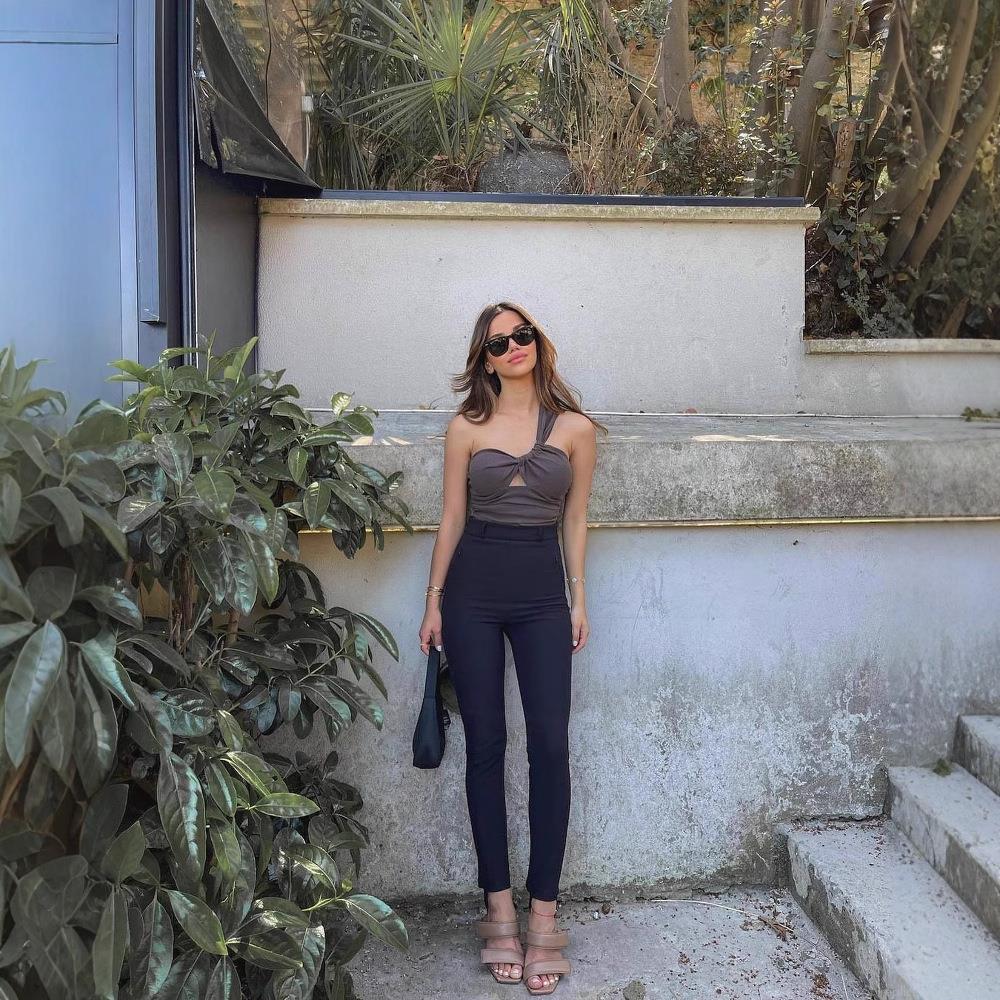 Women's Sexy One Shoulder Crop Top Asymmetric Ruched 100% Cotton Tank Top Solid Color Hollow Out Sleeveless Summer Blouse For Party Clubwear