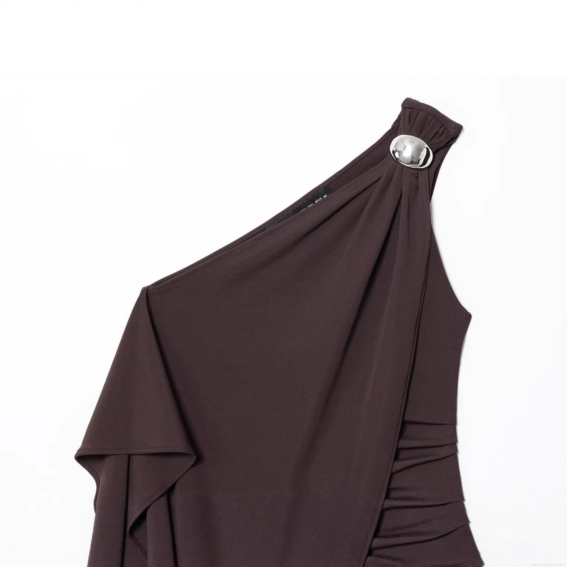 Women's Sexy One Shoulder Ruched Crop Top Asymmetric Slim Fit Polyester Tank Top With Silver Metal Buckle Coffee Brown Sleeveless Shirt For Clubwear Party
