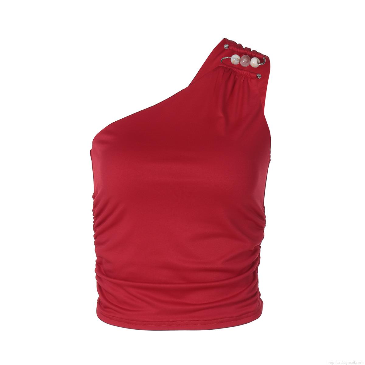 • Women's Sexy One Shoulder Ruched Crop Top Beaded Strap Polyester Spandex Slim Fit Sleeveless Tank Top For Summer Party Clubwear
