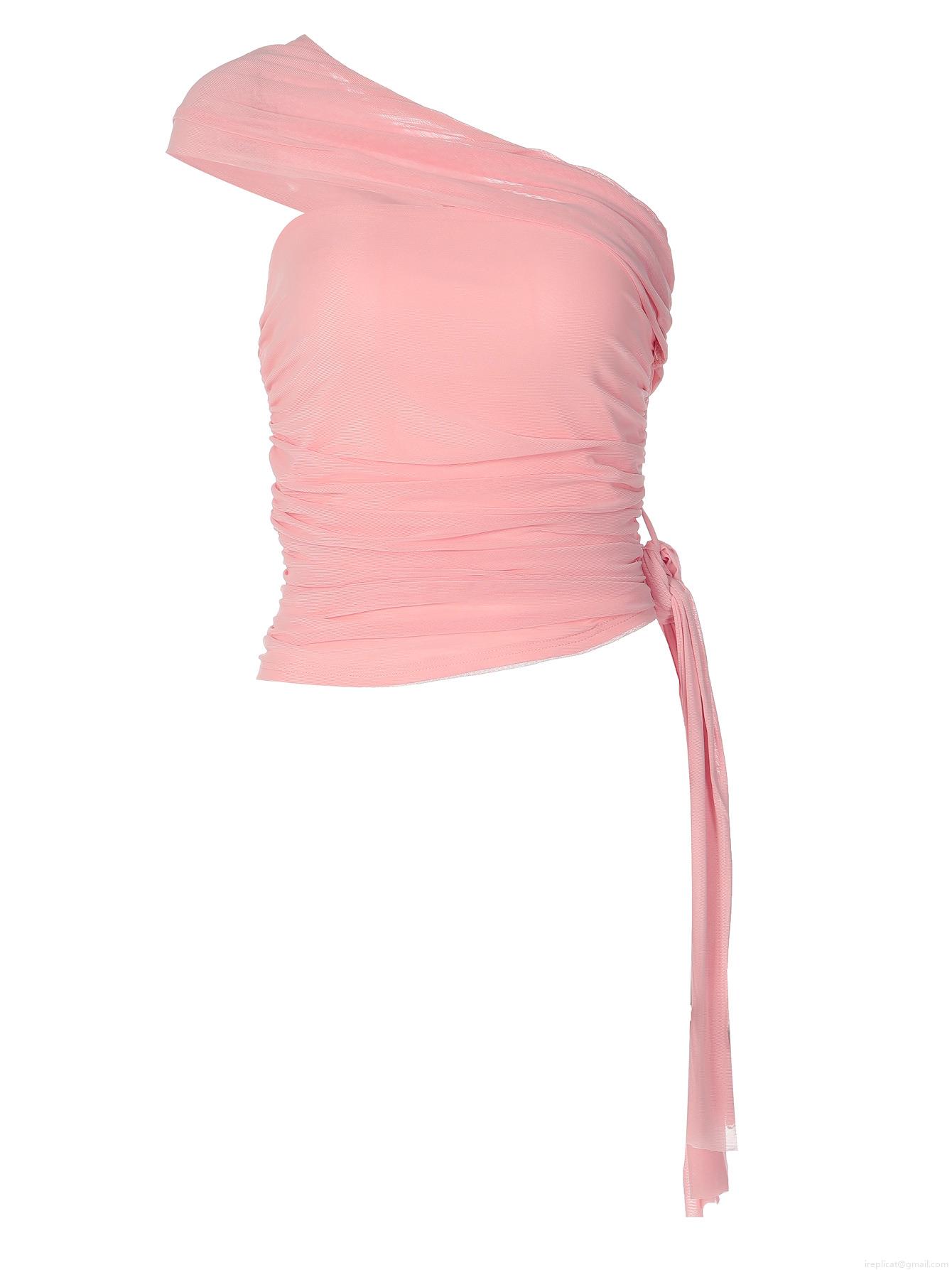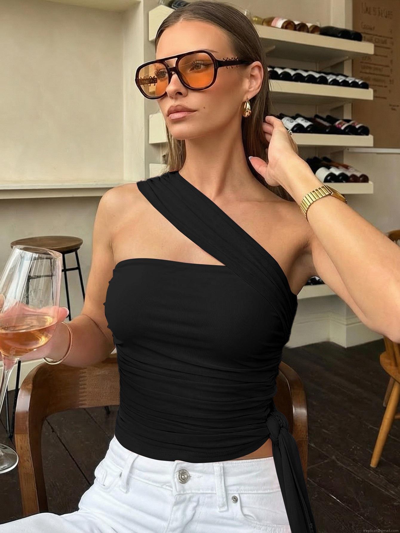 • Women's Sexy One Shoulder Ruched Crop Top Side Drawstring Polyester Spandex Patchwork Ribbon Slim Fit Solid Color Summer Party Streetwear Clubwear