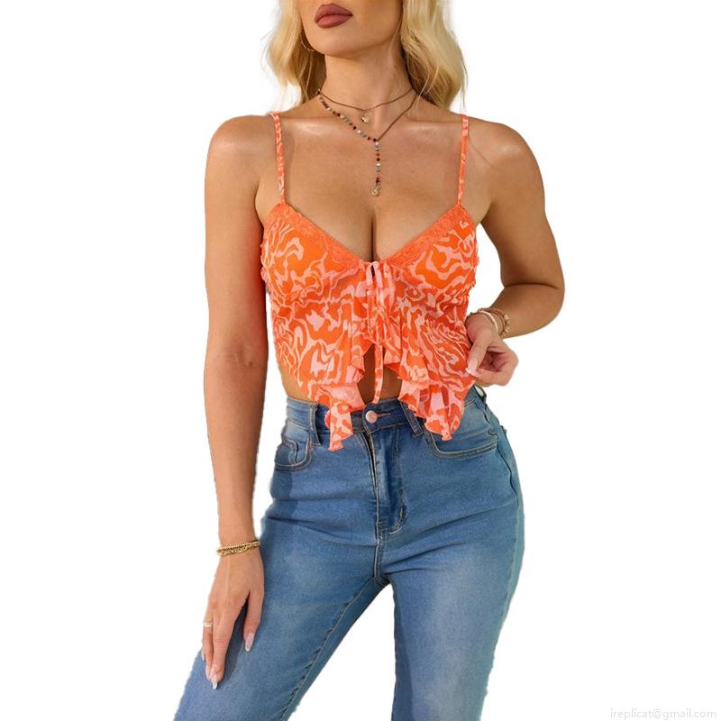 • Women's Sexy Orange Floral Print Mesh Camisole With Lace Trim And Tie Front Ruffle Crop Top Summer Vacation Sleeveless Tank Top For Women