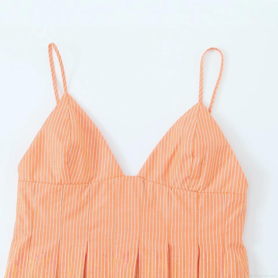 • Women's Sexy Orange White Vertical Striped V-Neck Camisole Slim Fit Pleated Hem Strappy Top Summer Casual Sleeveless Polyester Poplin Blouse
