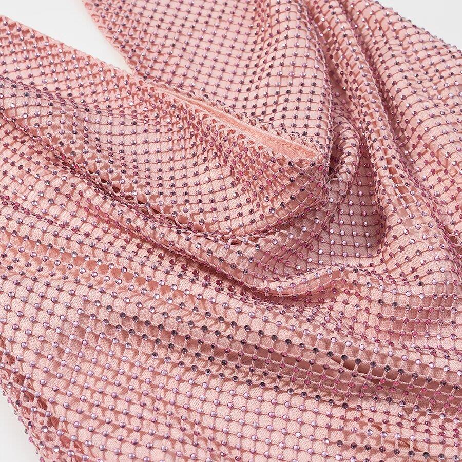 Women's Sexy Pink Rhinestone Halter Camisole Top Backless Cowl Neck Mesh Slim Fit Party Clubwear Top For Night Out Summer Fashion