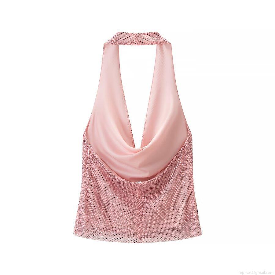 • Women's Sexy Pink Rhinestone Halter Camisole Top Backless Cowl Neck Mesh Slim Fit Party Clubwear Top For Night Out Summer Fashion