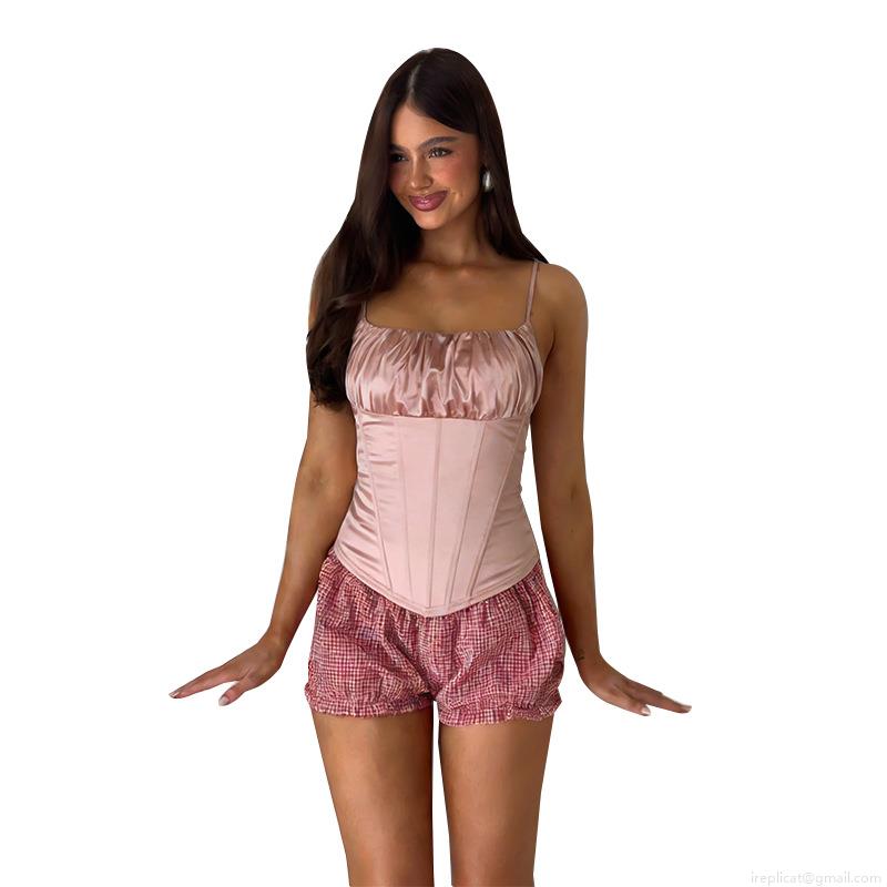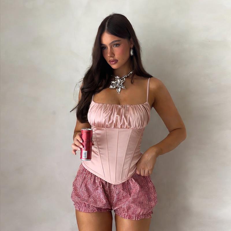 • Women's Sexy Pink Satin Corset Cami Top Ruched Fishbone Bodycon Backless Lace Up Crop Top Sleeveless Tank Top For Summer Party Clubwear