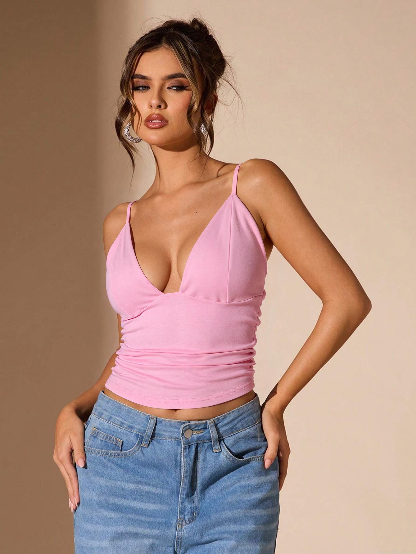 • Women's Sexy Pink V-Neck Ruched Tank Top French Style Slim Fit Cropped Camisole Cotton Blend Summer Top For Party Daily Wear