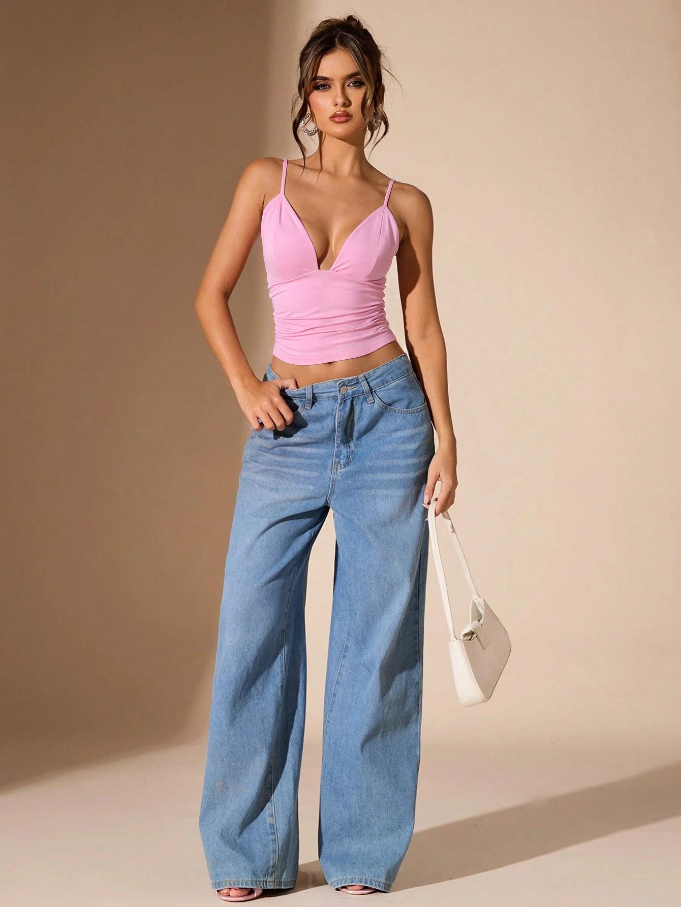 Solid Color, Pleats, Navel Exposed, Thin Shoulder Straps, Deep V-neck