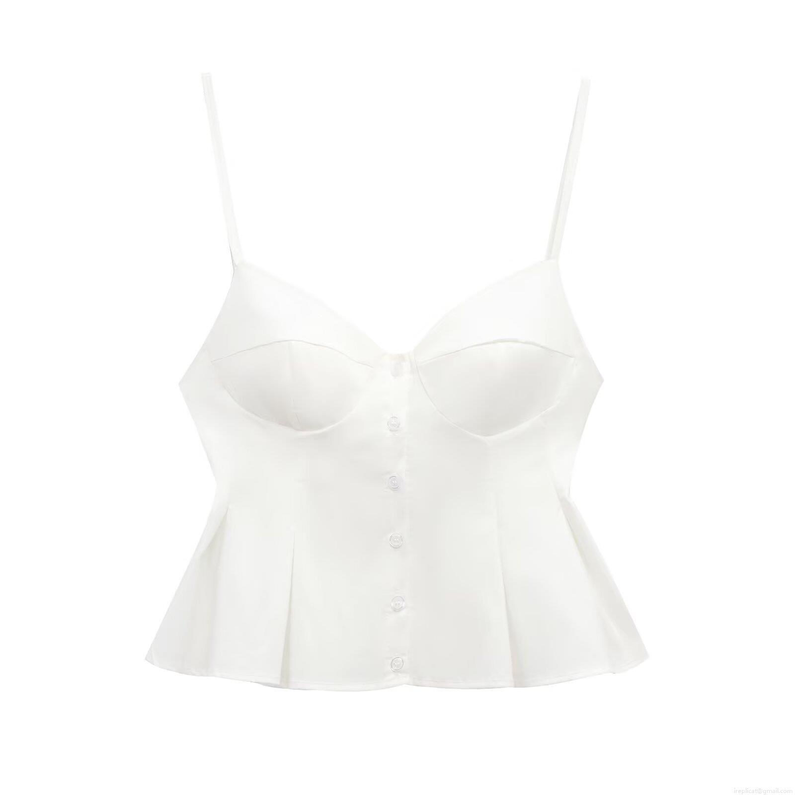 Solid Color, Pleats, Ruffles, Vertical Stripes, Button, Thin Shoulder Straps, Bra Cutting