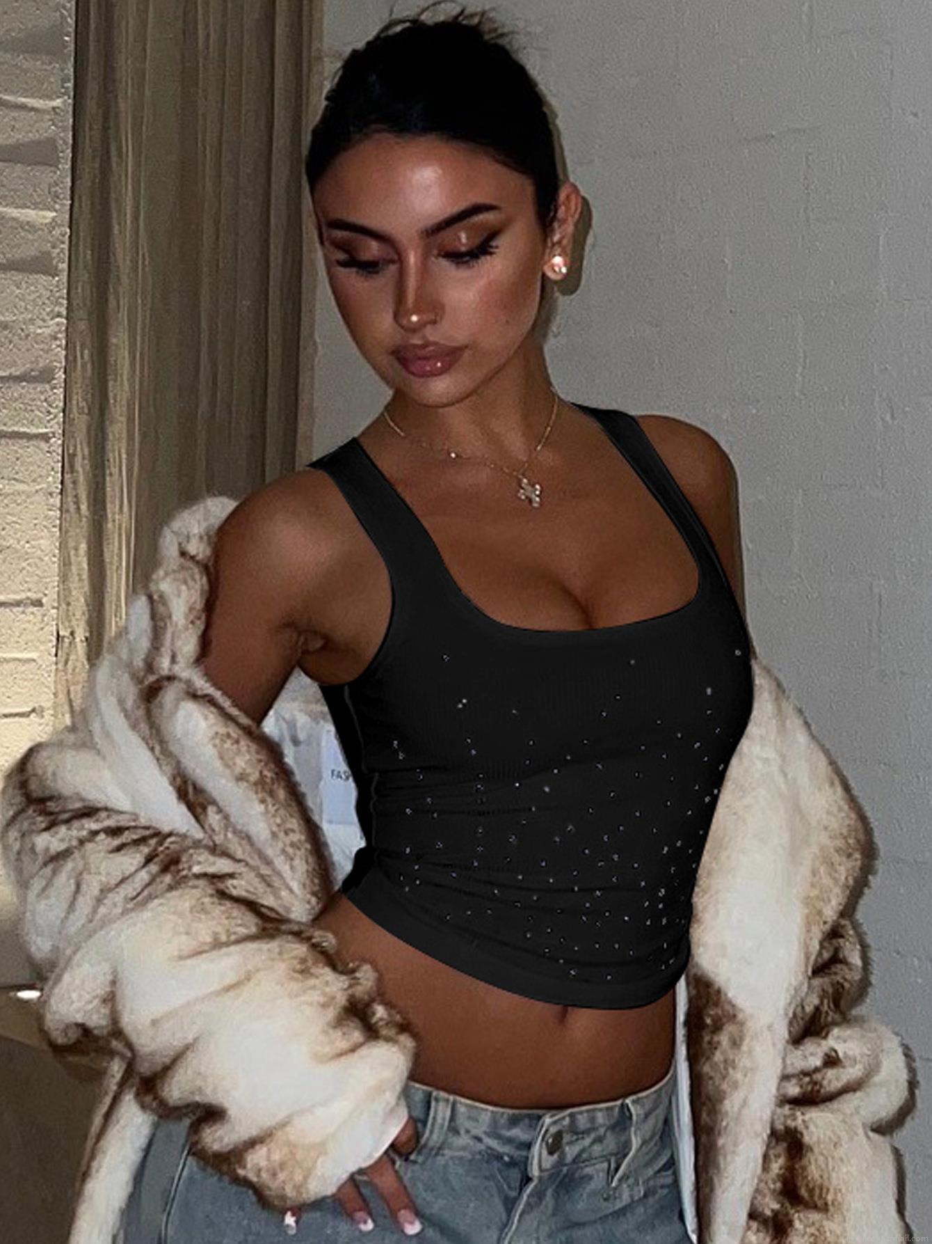 • Women's Sexy Ribbed Knit Tank Top With Hot Rhinestones Slim Fit Sleeveless Crop Top Summer Streetwear Party Cami For Women