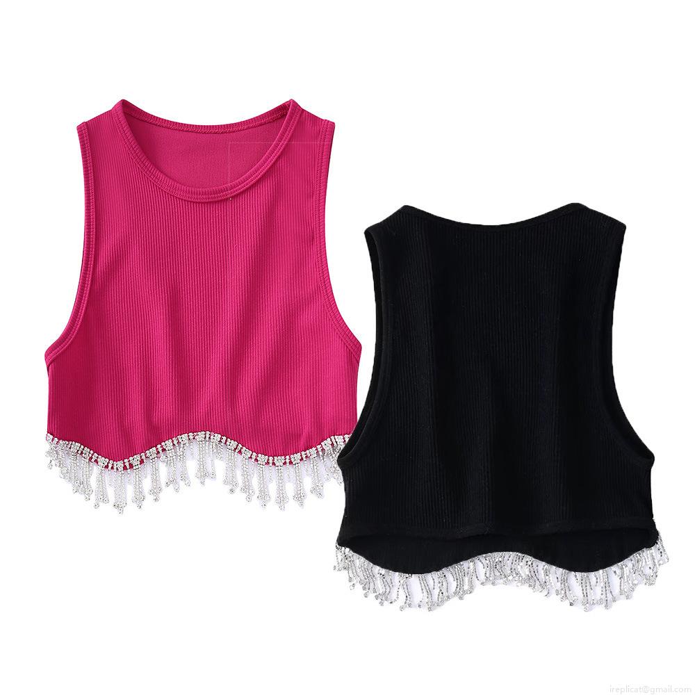 • Women's Sexy Round Neck Ribbed Knit Crop Top With Rhinestone Metal Chain Tassel Hem Sleeveless Slim Fit Tank Top For Party Clubwear Summer Fashion
