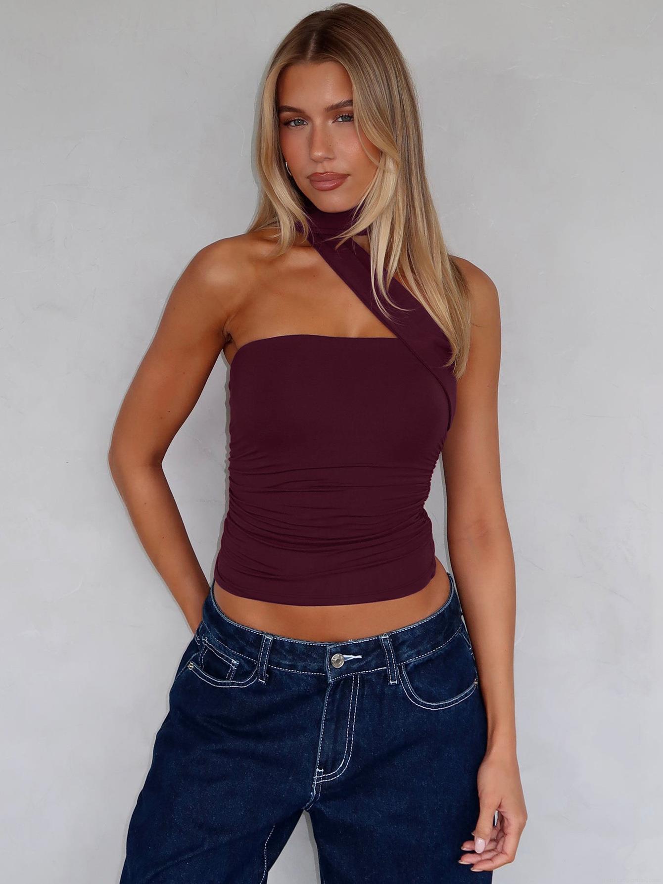 • Women's Sexy Ruched Tube Top Halter Neck Sleeveless Tank Top With Streamers Asymmetrical Pleated Summer Streetwear Crop Top For Women