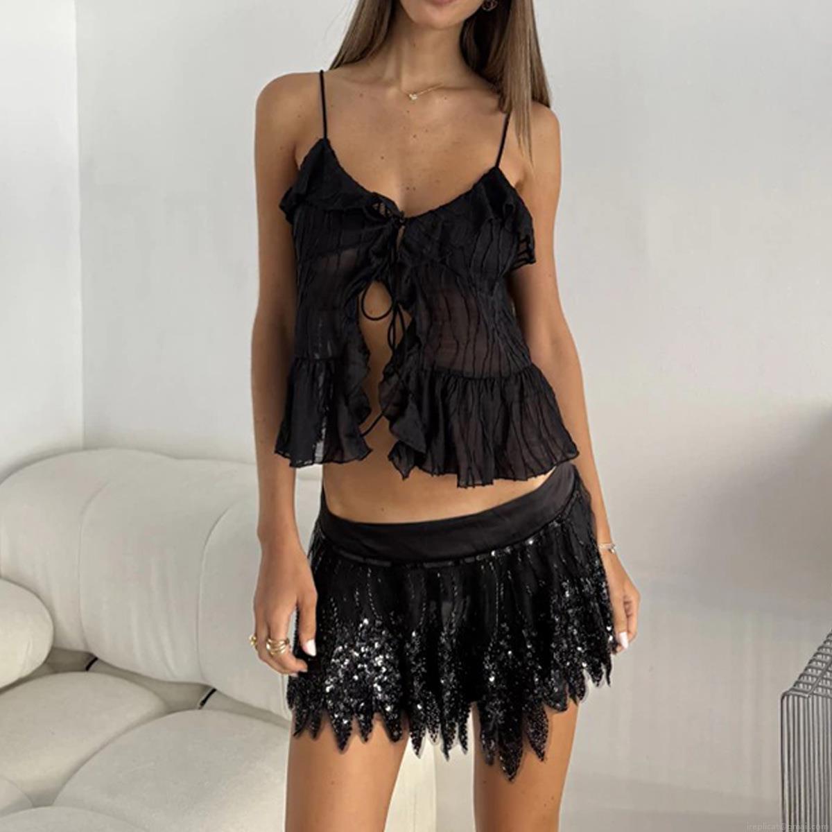 • Women's Sexy Ruffle Hem Cami Top Pleated Chiffon Lace Up Backless Tank Top Sleeveless Irregular Crop Top For Summer Beach Club Party