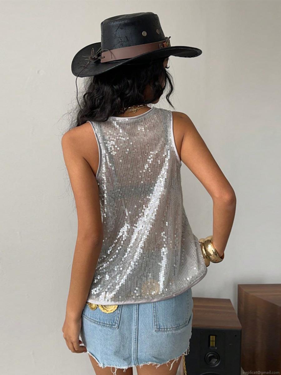 • Women's Sexy Silver Sequin Tank Top Loose Fit Sleeveless Round Neck Vest Shiny Party Clubwear Streetwear Camisole Tops For Ladies