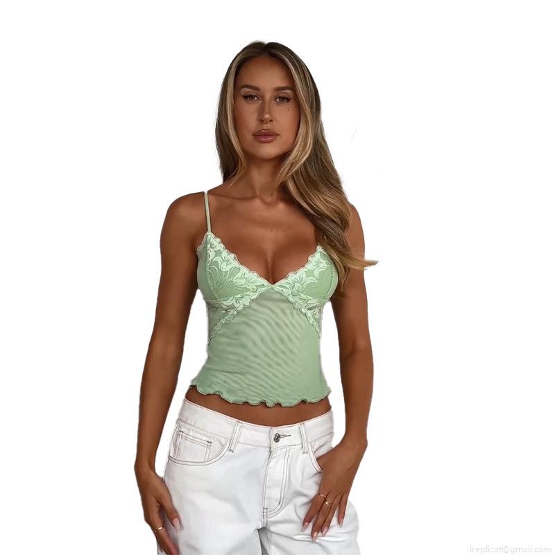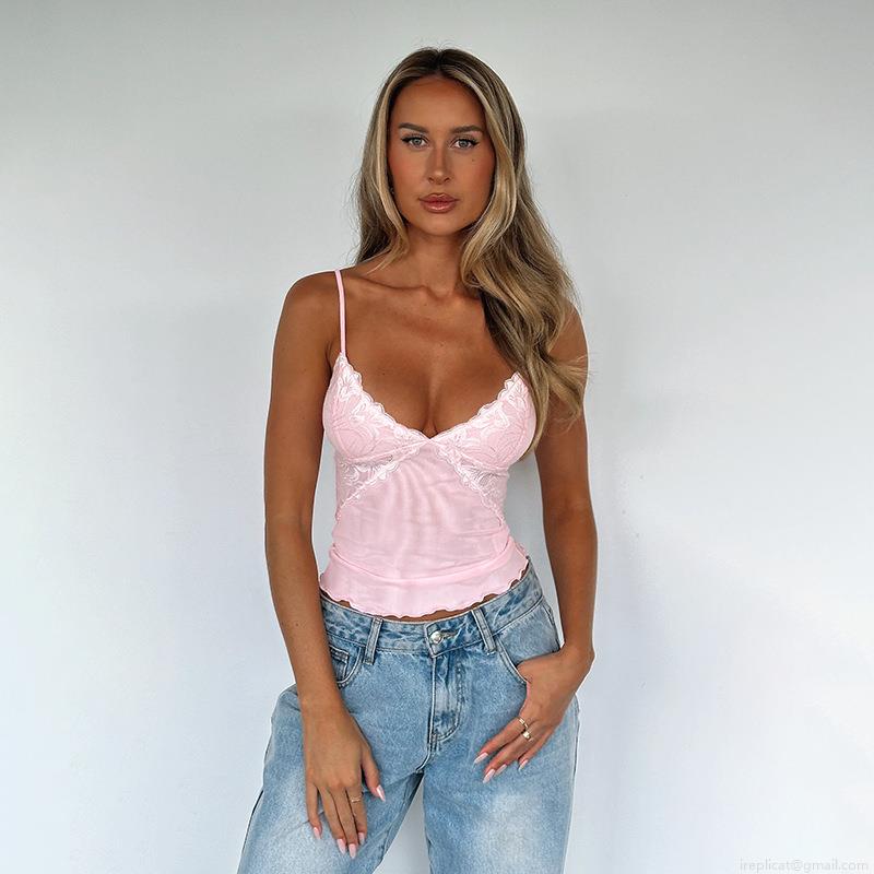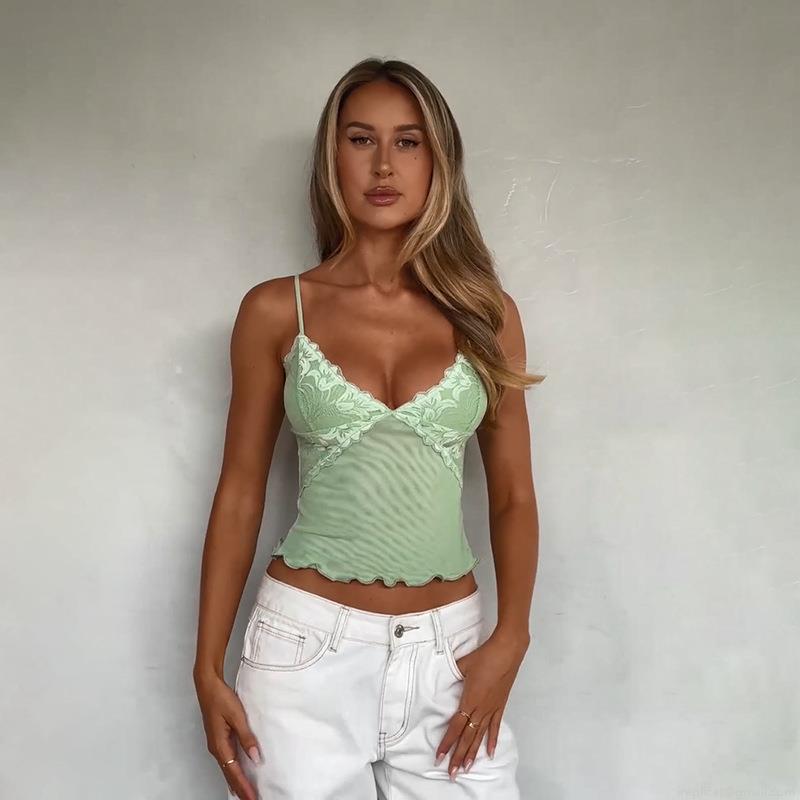• Women's Sexy V Neck Lace Trim Camisole Top Slim Fit Polyester Spandex Ribbed Mesh Tank Top For Summer Streetwear Party Ladies
