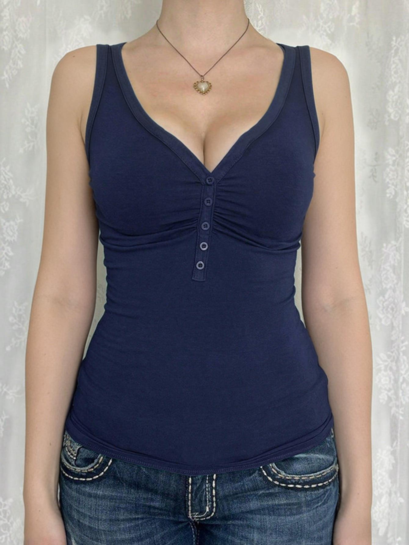 • Women's Sexy V Neck Ribbed Tank Top Viscose Spandex Slim Fit Henley Shirt With Buttons Ruched Casual Summer Sleeveless Vest Top For Women