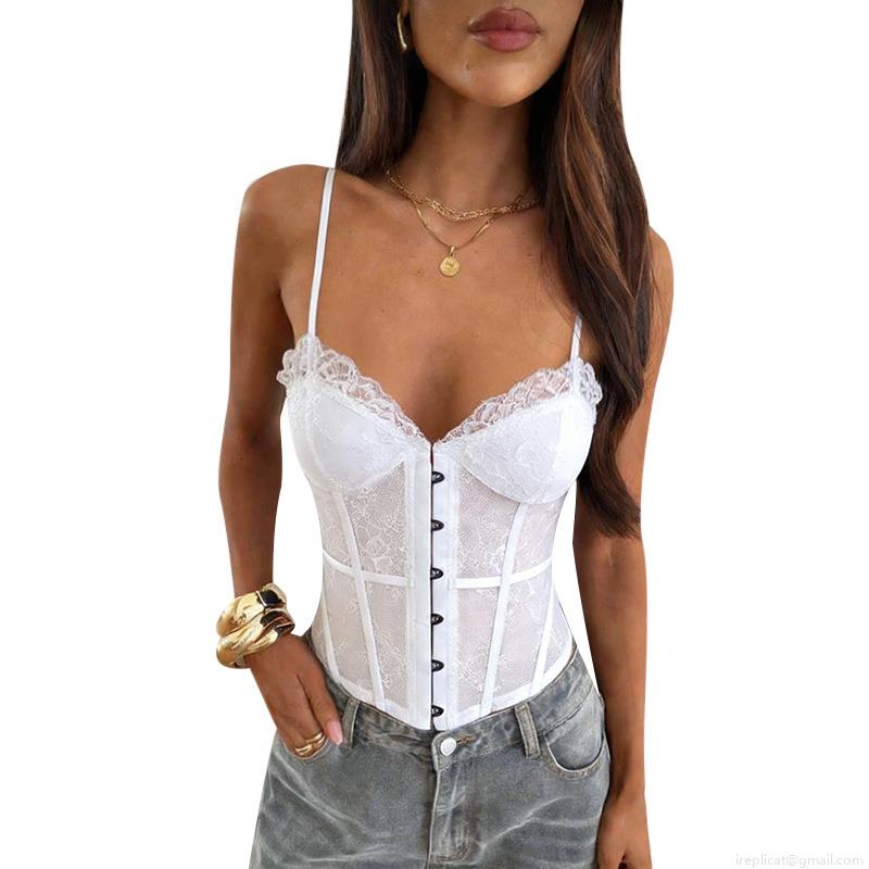 • Women's Sexy White Lace Mesh Corset Top Slim Fit Fishbone Support Tank Top With Front Hook and Eye Closure Spaghetti Strap Camisole For Party Club Wear