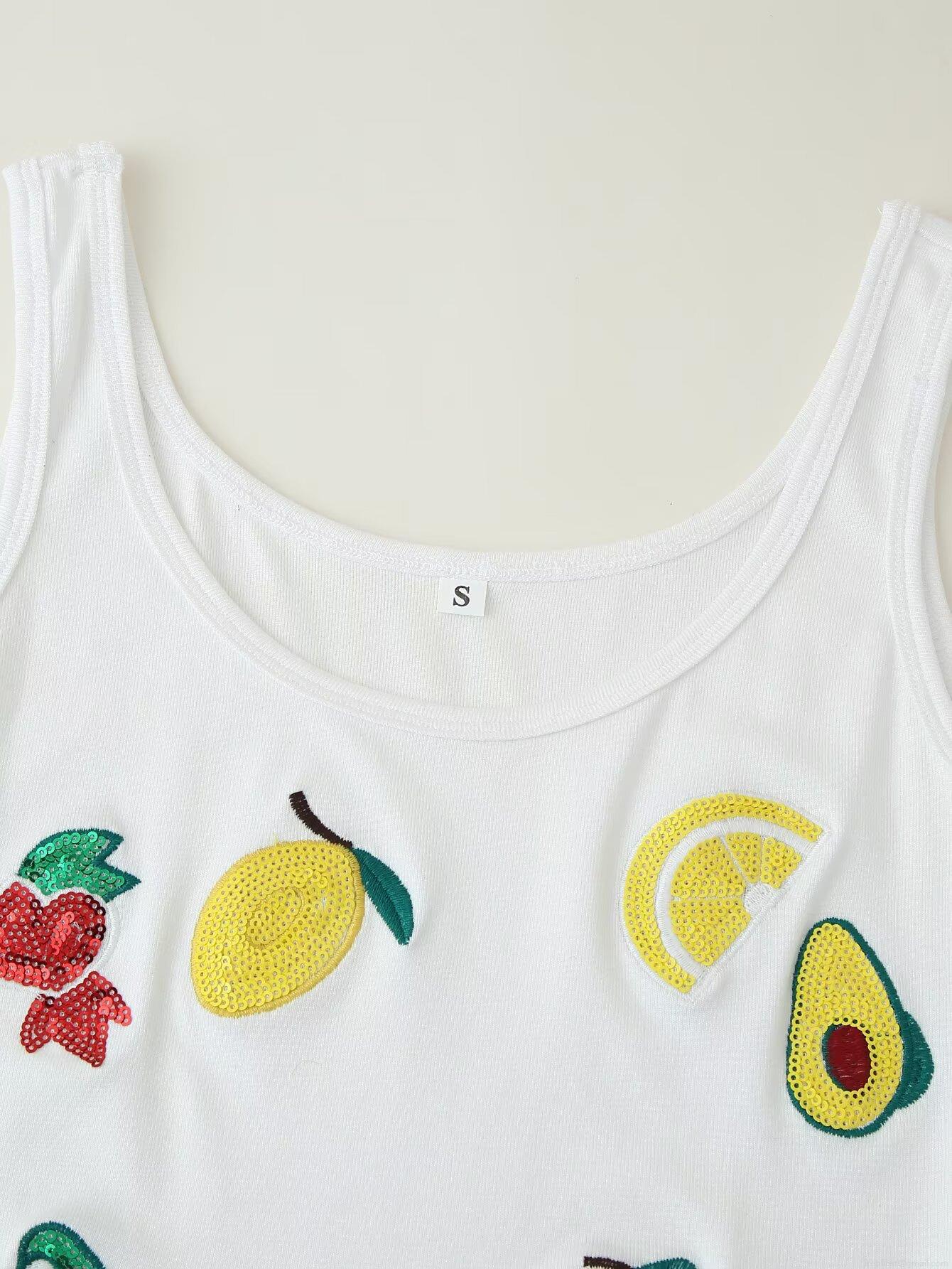 • Women's Sexy White Sequin Fruit Embroidery Crop Top Y2K Sleeveless Knit Tank Top U-Neck Vest For Summer Casual Vacation Party