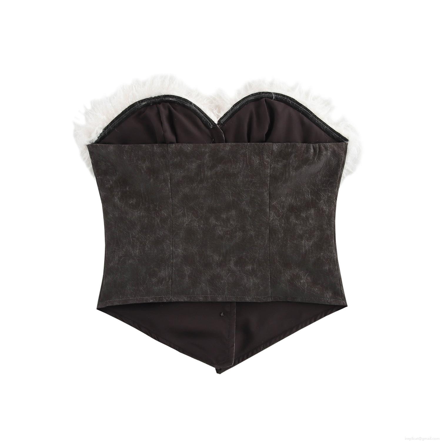 • Women's Sexy Y2K Spicy Girl Style Tube Top Faux Suede Patchwork White Faux Fur Trim Cropped Top With Gold Buttons Slim Fit Streetwear Party Clubwear