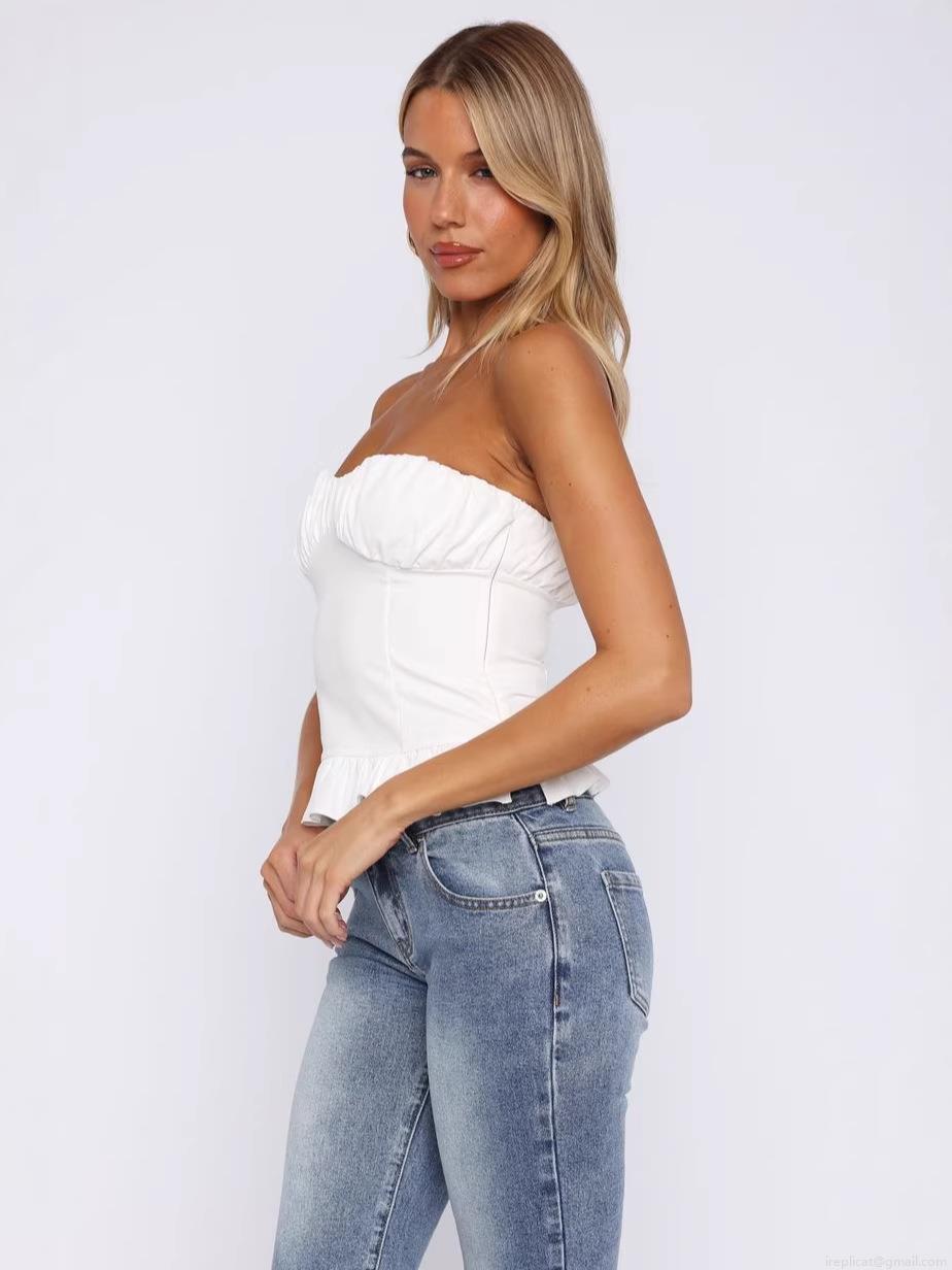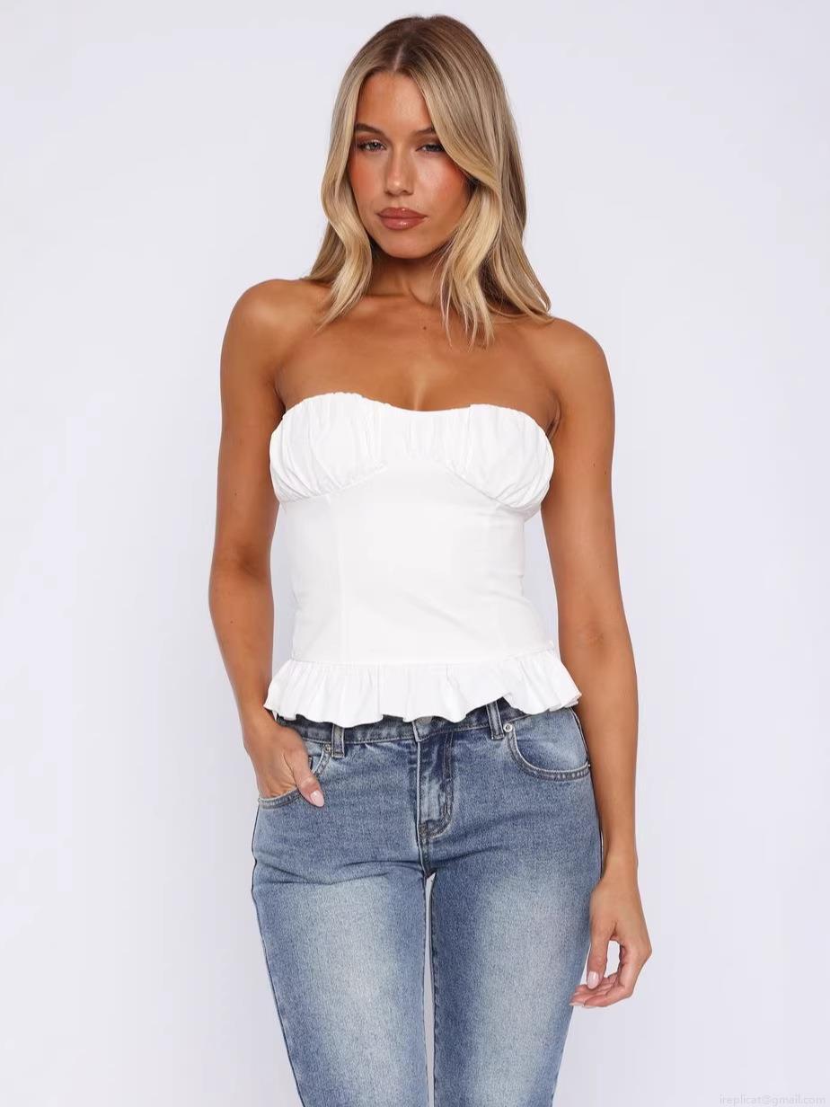 • Women's Sexy Y2K Strapless Tube Top Ruched Peplum Hem Polyester Spandex Solid White Summer Crop Top Sleeveless Shirt Party Vacation