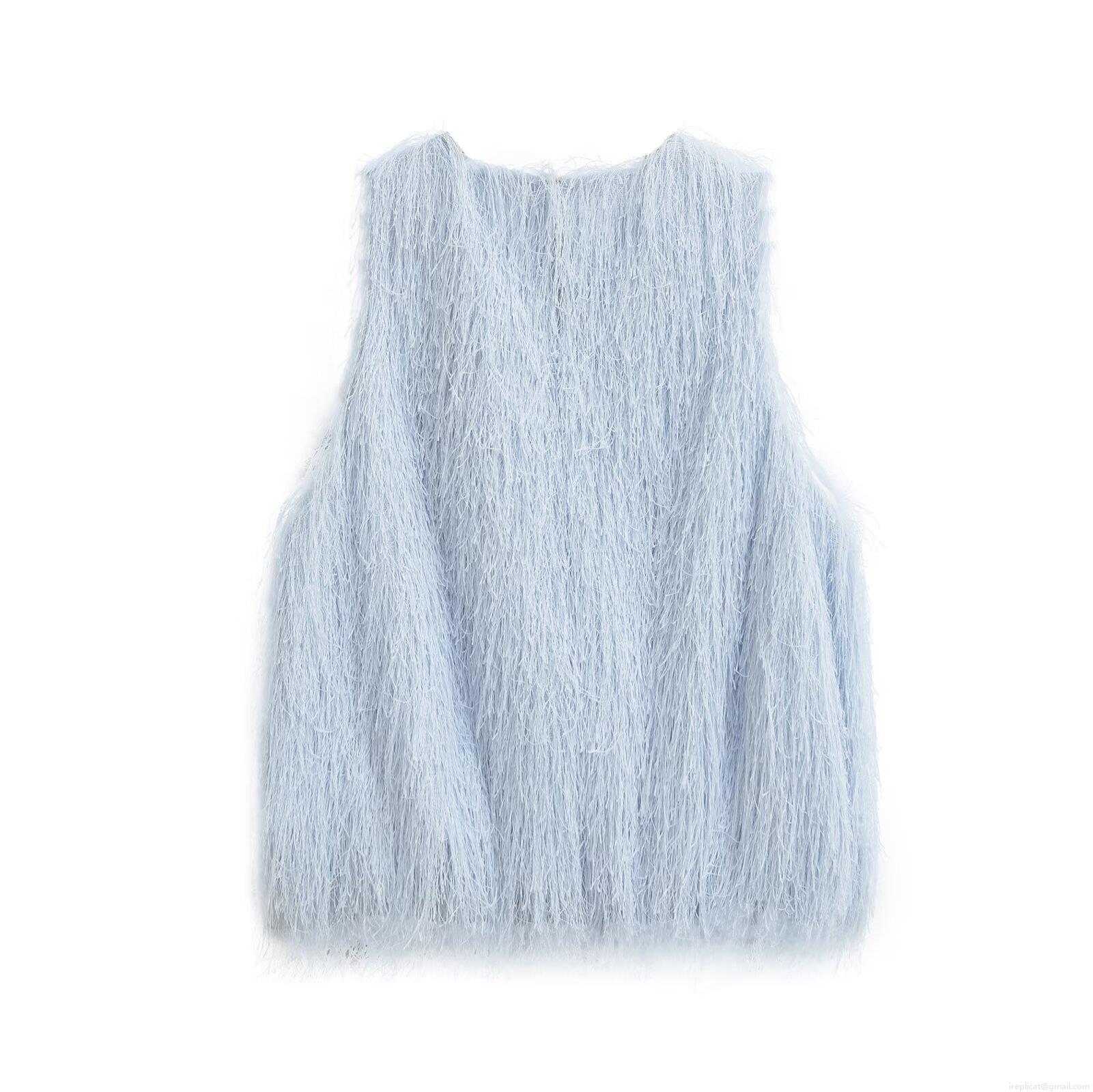 Women's Sleeveless Tassel Faux Fur Tank Top Casual Round Neck Streetwear Party Off-White Sky Blue Vest Top For Women