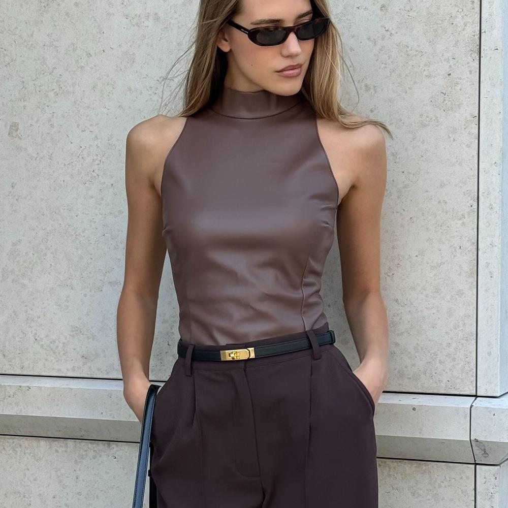 • Women's Slim Fit PU Leather Tank Top Half High Neck Sleeveless Solid Color Streetwear Vest Top For Daily Party Nightclub Fashionable