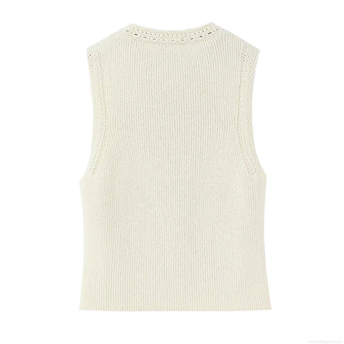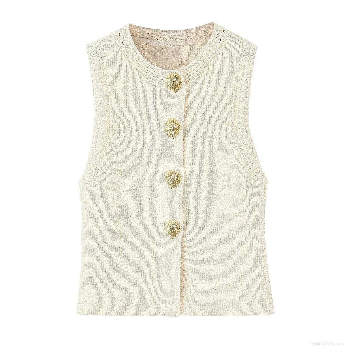 Women's Slim Fit Ribbed Knit Vest Sleeveless Cardigan With Gold Sunflower Buttons Round Neck Polyester Top For Office Daily Wear