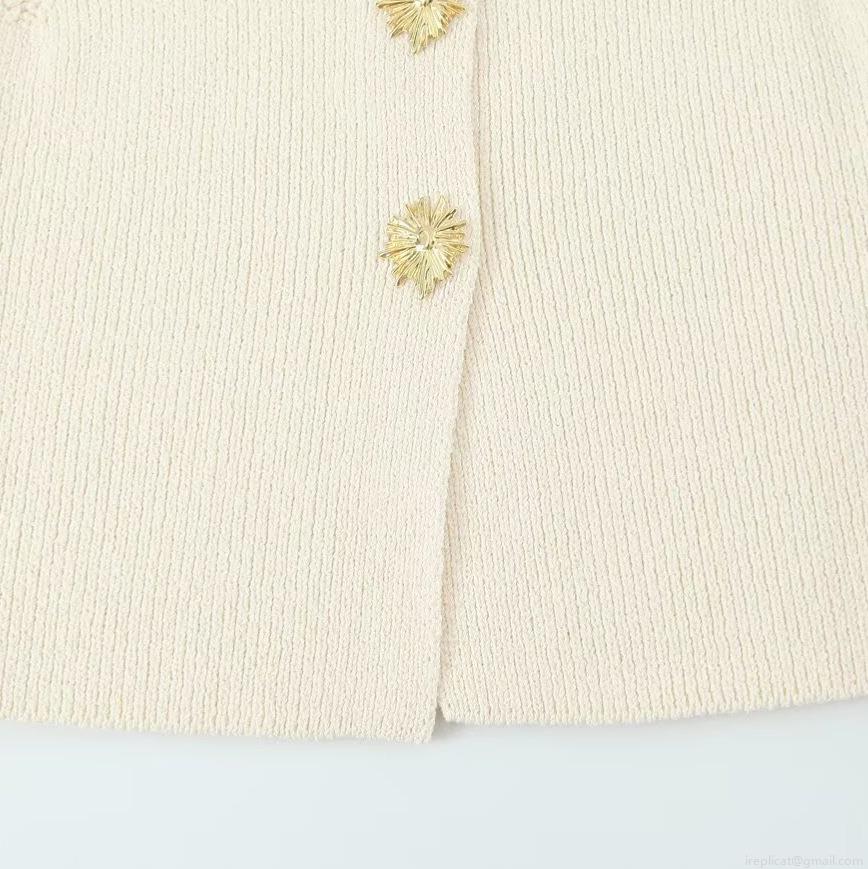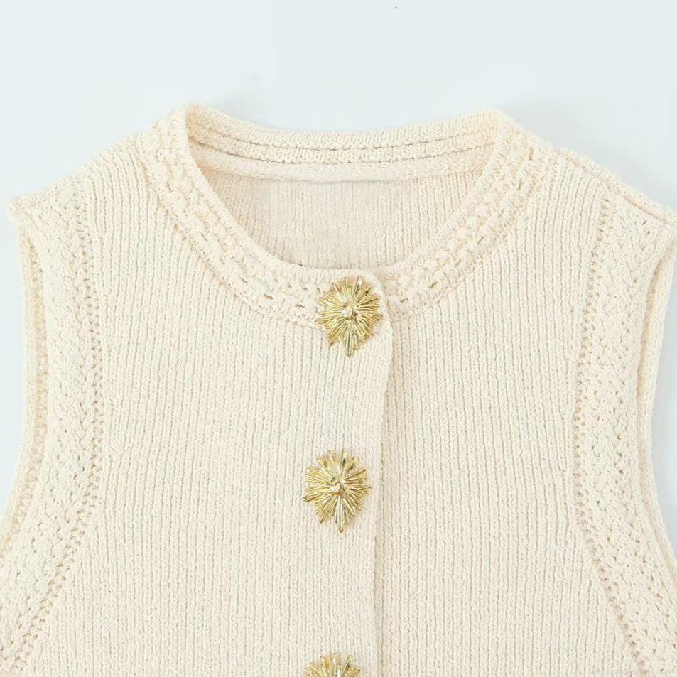 • Women's Slim Fit Ribbed Knit Vest Sleeveless Cardigan With Gold Sunflower Buttons Round Neck Polyester Top For Office Daily Wear