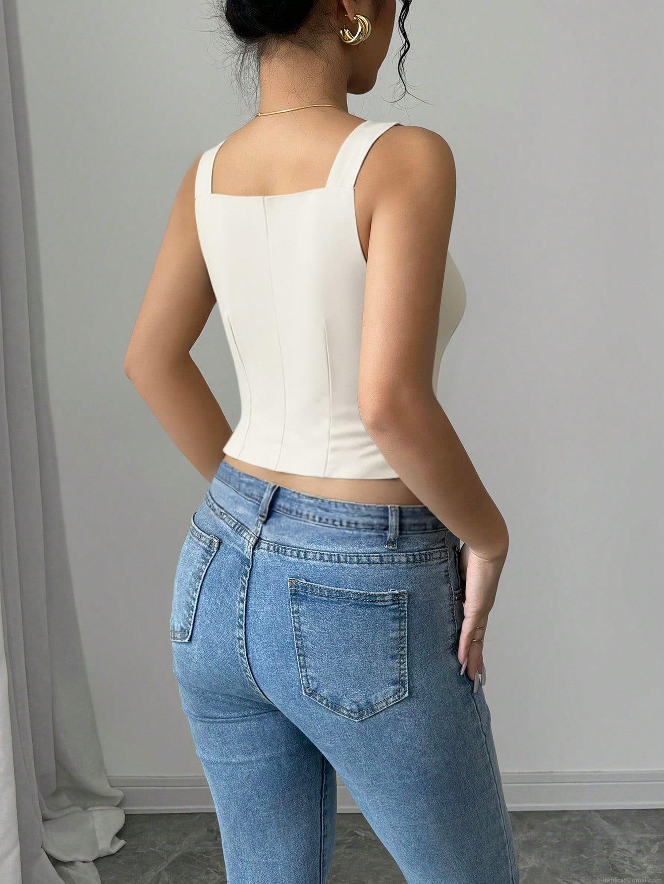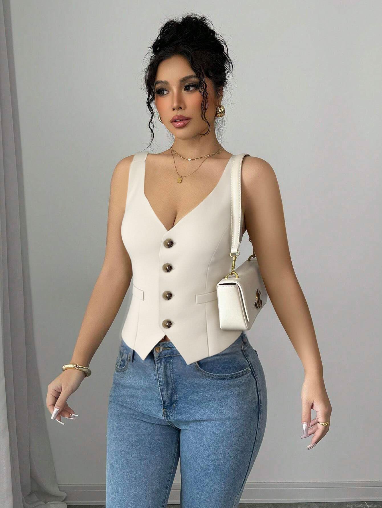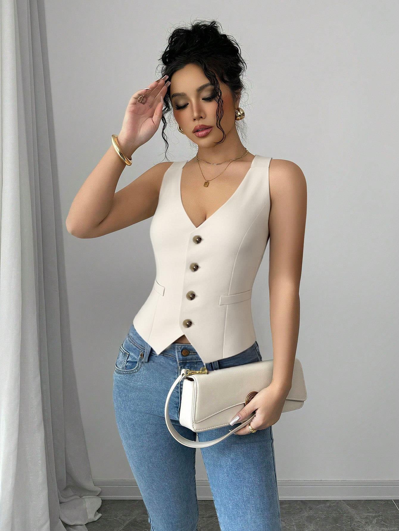 • Women's Slim Fit V-Neck Waistcoat Elegant Single Breasted 4 Buttons Asymmetrical Hem Sleeveless Polyester Blend Vest Retro Spicy Girl Style Office Lady Casual Top Beige