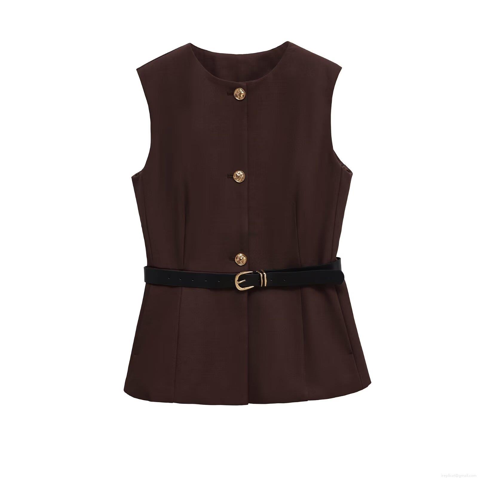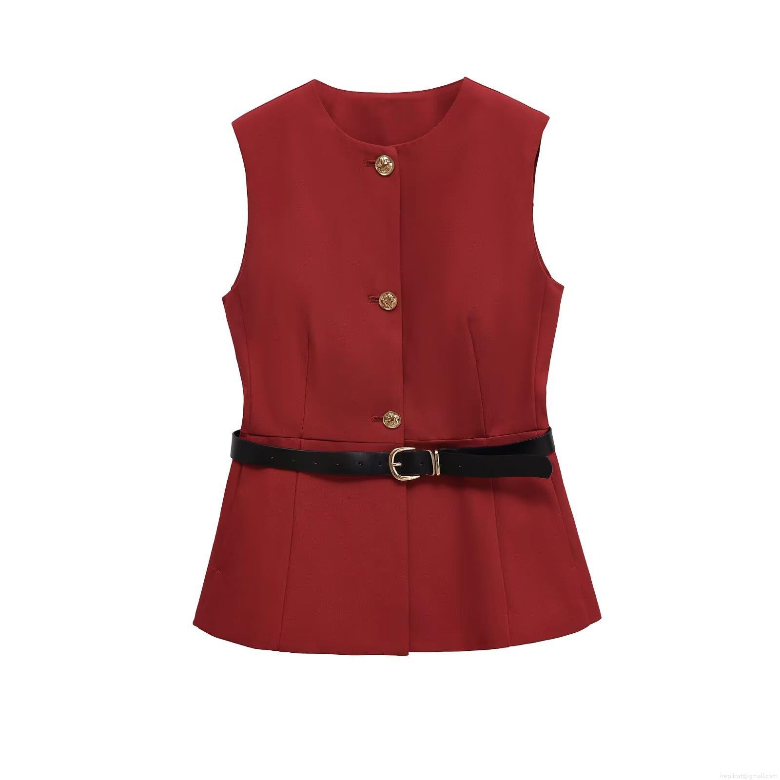 • Women's Solid Color Sleeveless Vest Top With Detachable Belt And Gold Metal Buttons Elegant Polyester Slim Fit Office Waistcoat For Ladies