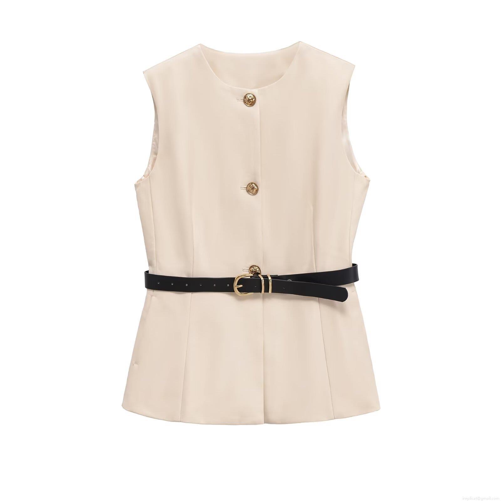 Women's Solid Color Sleeveless Vest Top With Detachable Belt And Gold Metal Buttons Elegant Polyester Slim Fit Office Waistcoat For Ladies