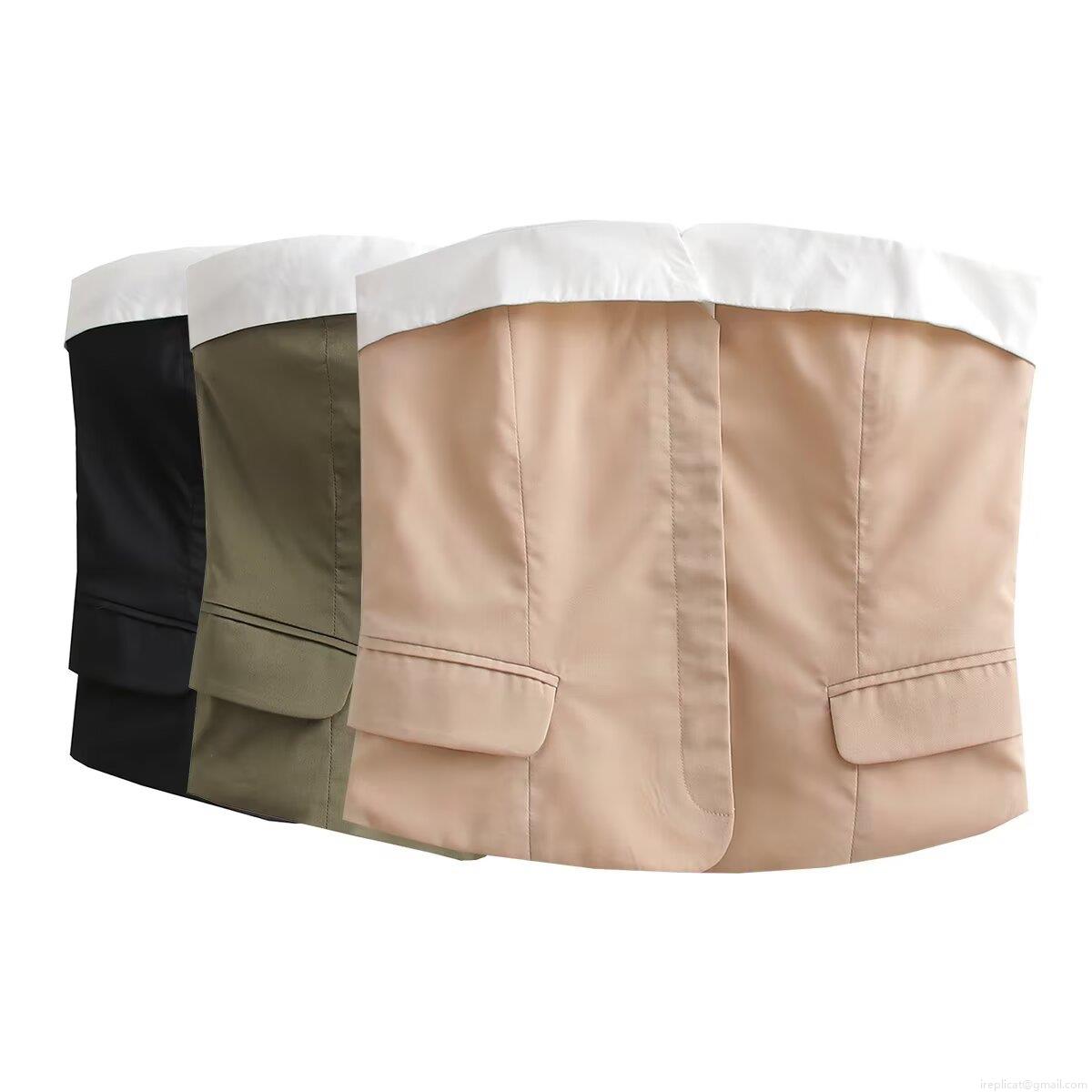 • Women's Strapless Tube Top Polyester Contrast Color Corset Style Slim Fit Crop Top With Lapel Detail And Decorative Pockets For Daily Chic Streetwear