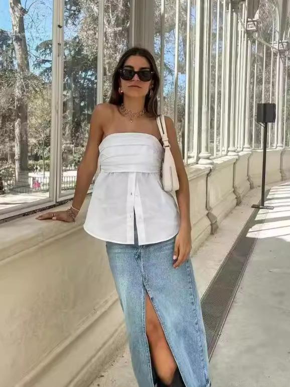 • Women's Strapless Tube Top Y2K Western Street Style 100% Polyester Button Front Ruffle Slim Fit Sexy Crop Top For Summer Casual Party Daily Wear