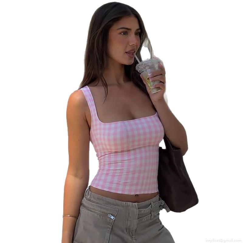• Women's Summer Fashion Plaid Square Neck Cropped Tank Top Sexy Slim Fit Sleeveless Pink White Gingham Camisole Vest Top For Beach Party