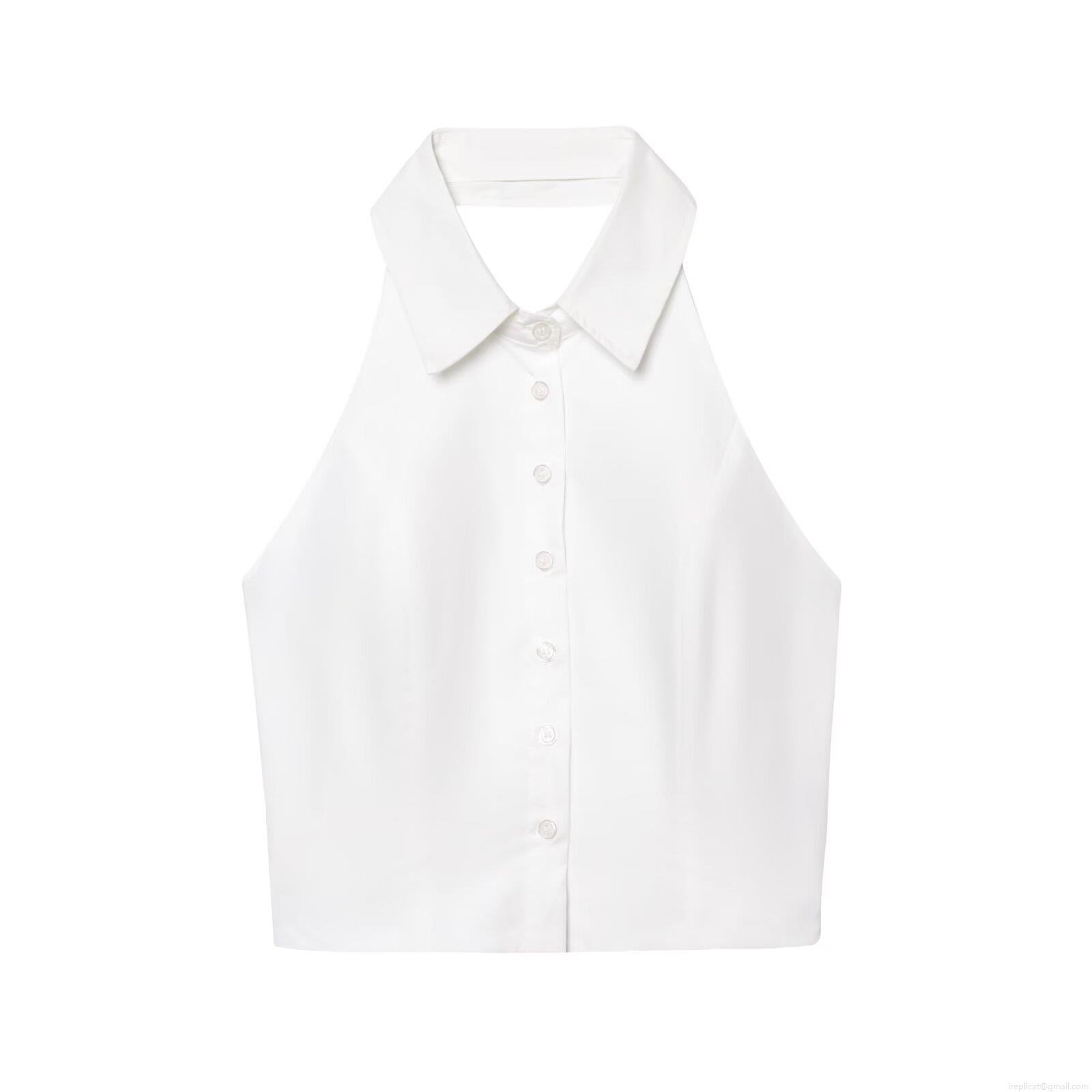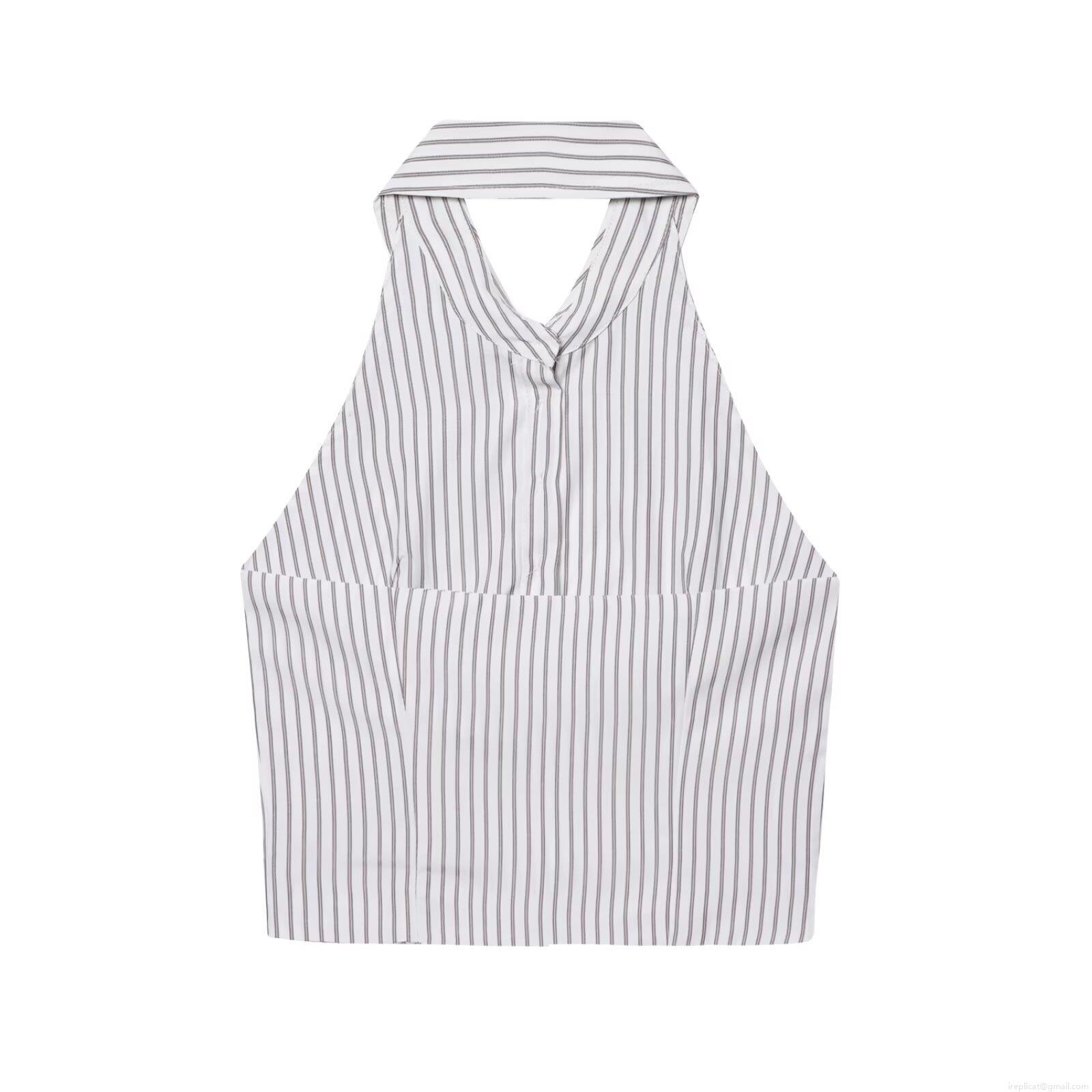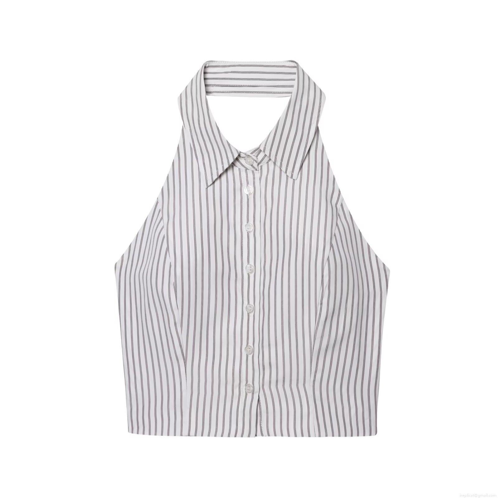 • Women's Summer Halter Neck Cropped Tank Top With Shirt Collar Backless Button Down Polyester Striped Sleeveless Vest Streetwear Sexy Camisole For Daily Vacation