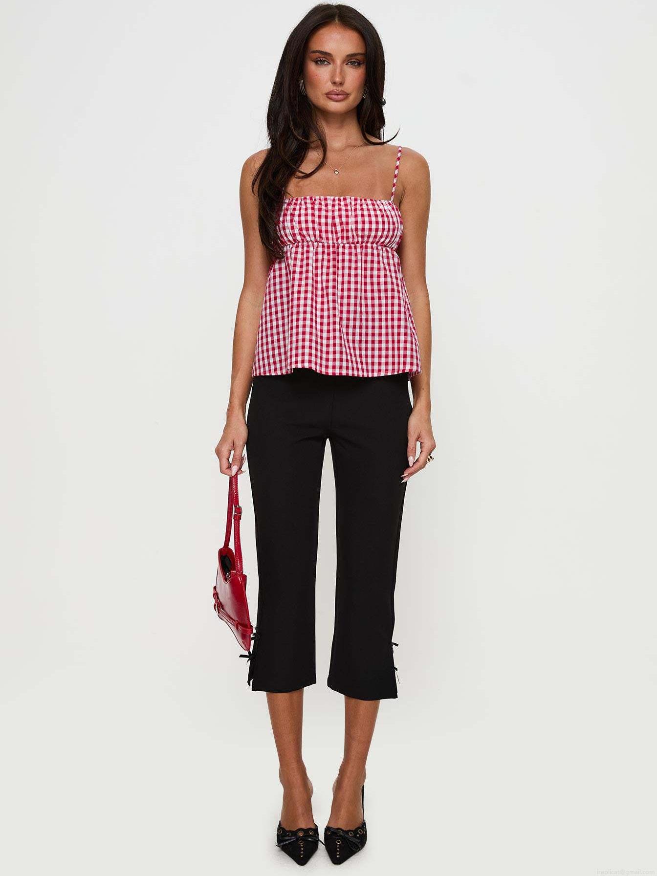 • Women's Summer Red White Gingham Cami Top Sleeveless Square Neck Peplum Blouse Polyester Plaid Ruffle Back Smocked Cami For Casual Beach Vacation Women