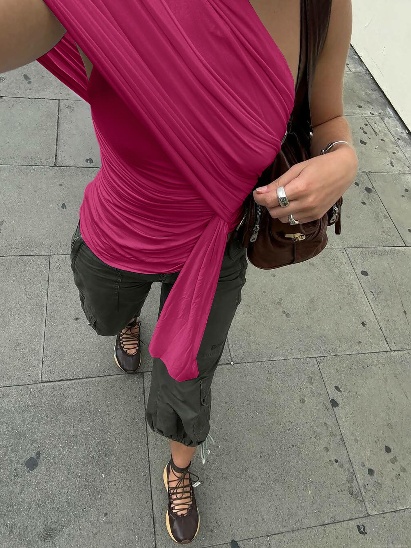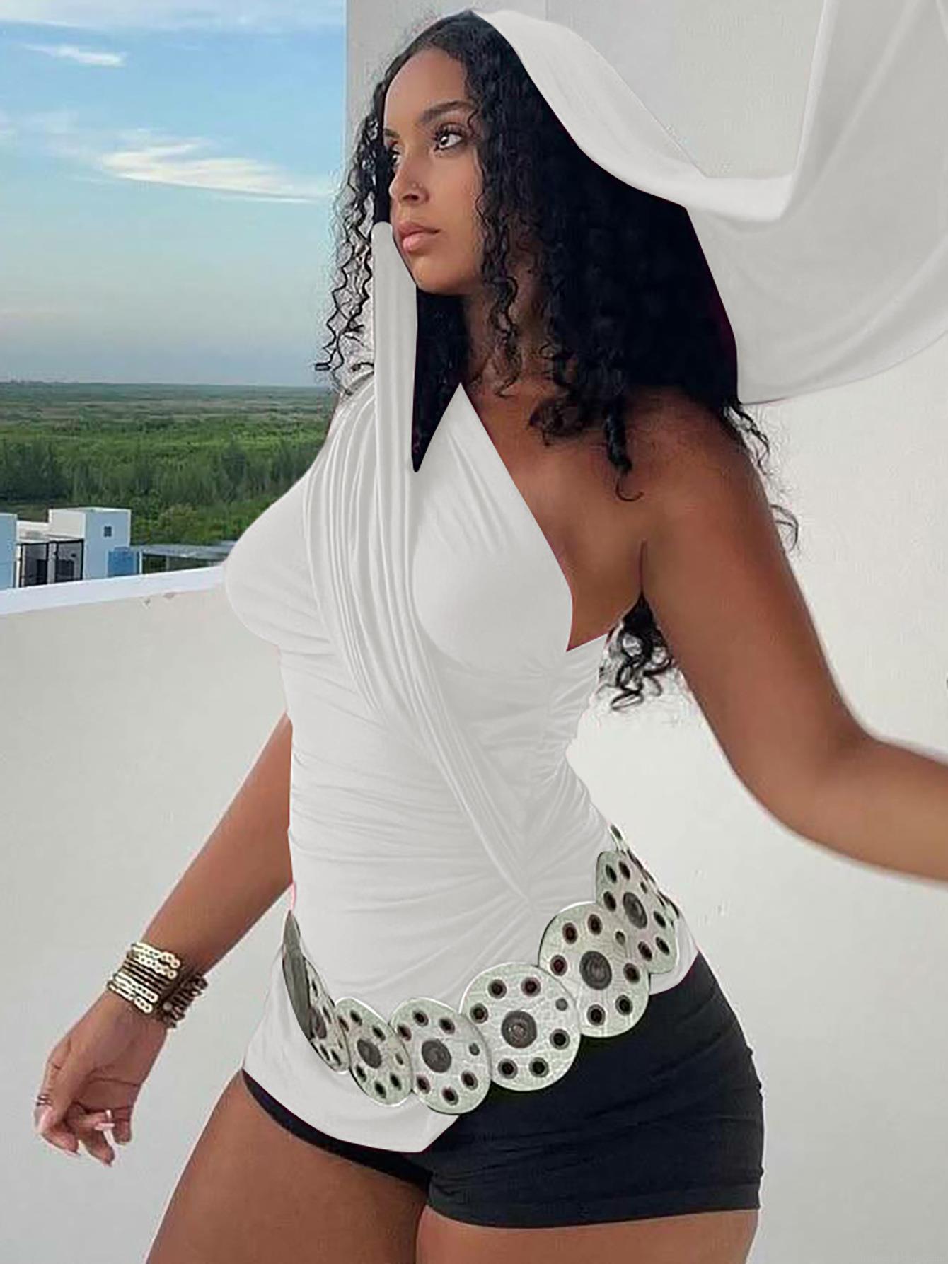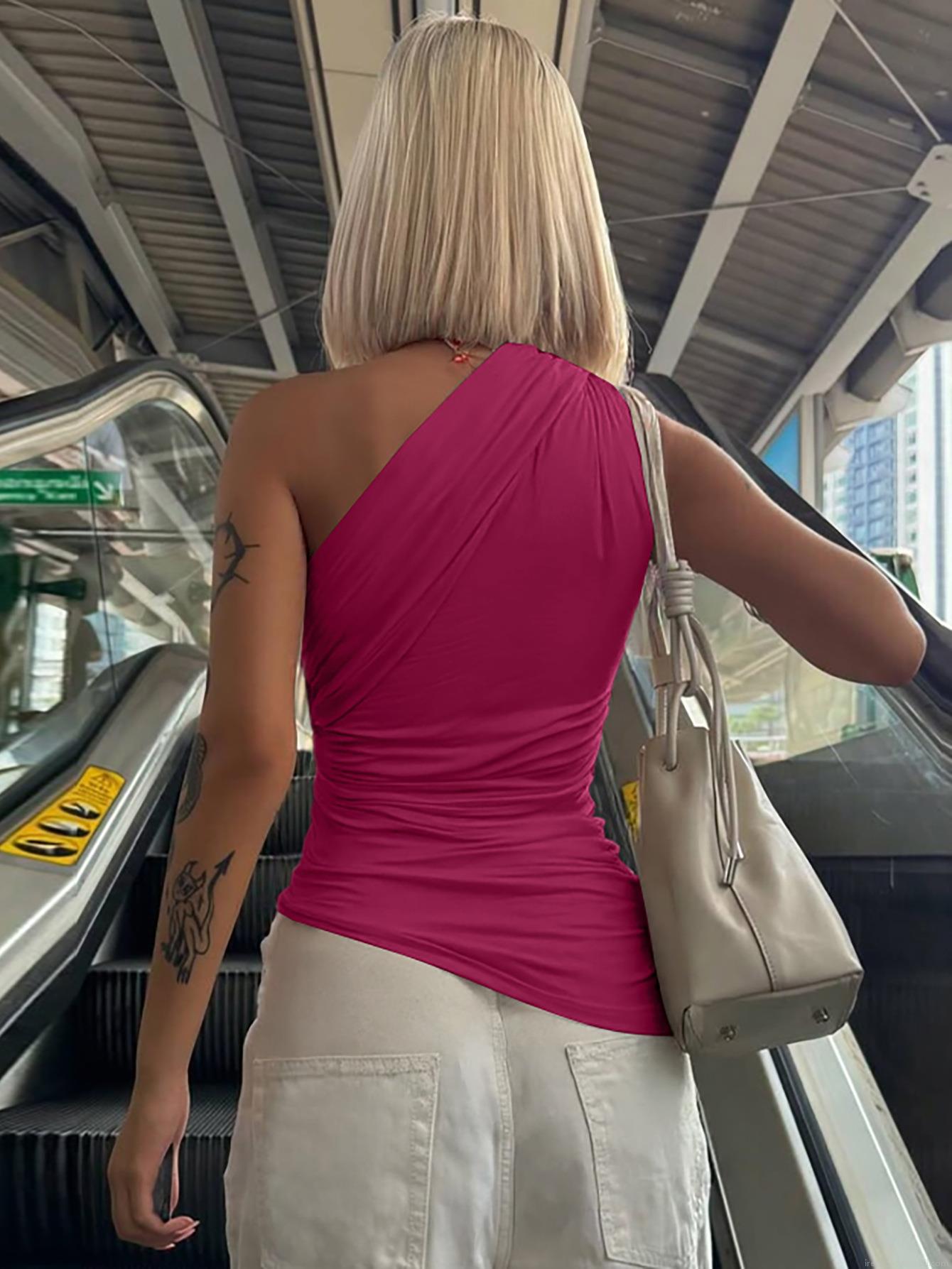• Women's Summer Sexy One Shoulder Irregular Pleated Tank Top Solid Color Sleeveless Streamer Slim Fit Vest Top Streetwear