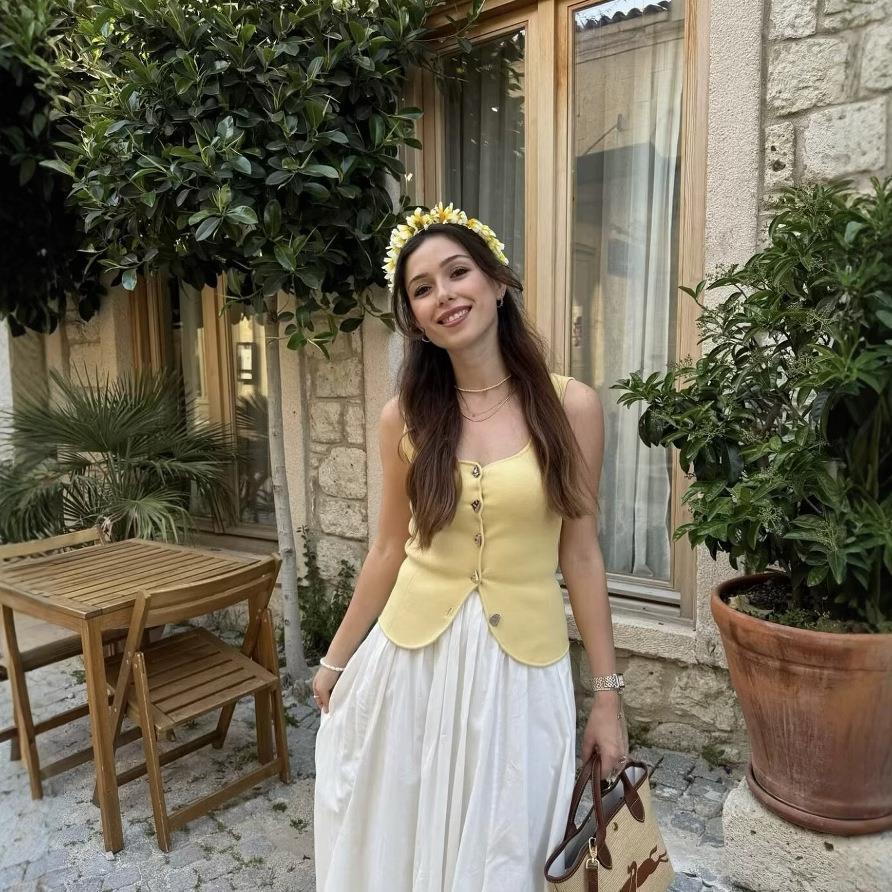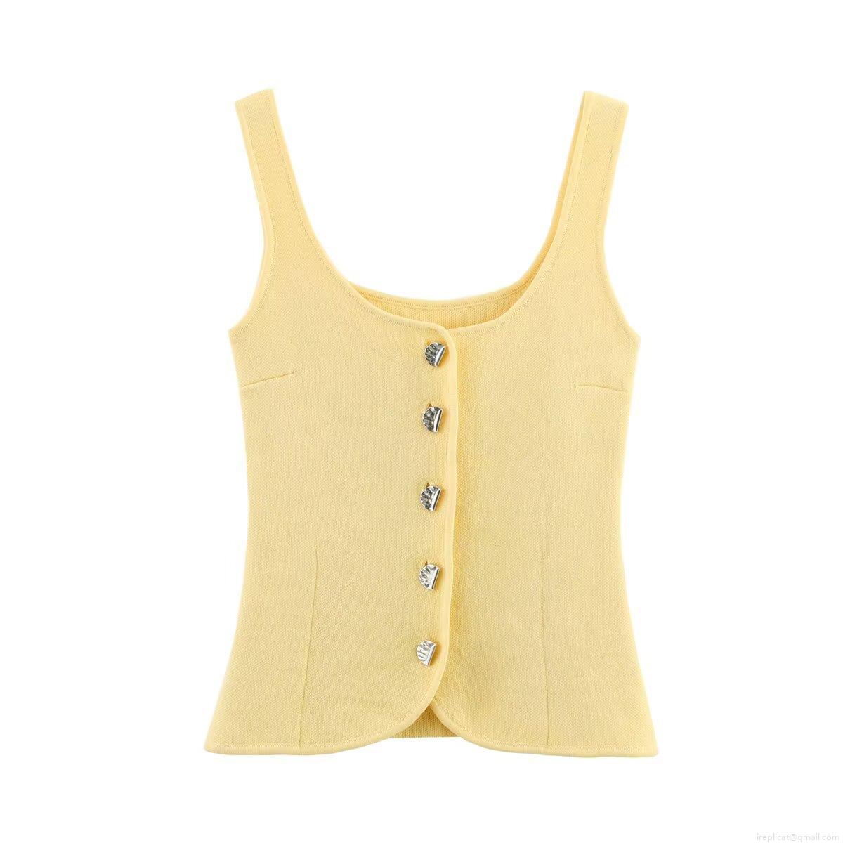 • Women's Sweet Light Yellow Knit Tank Top Square Neck Slim Fit Sleeveless Ribbed Vest With Decorative Metal Buttons Summer Fashion Casual Top