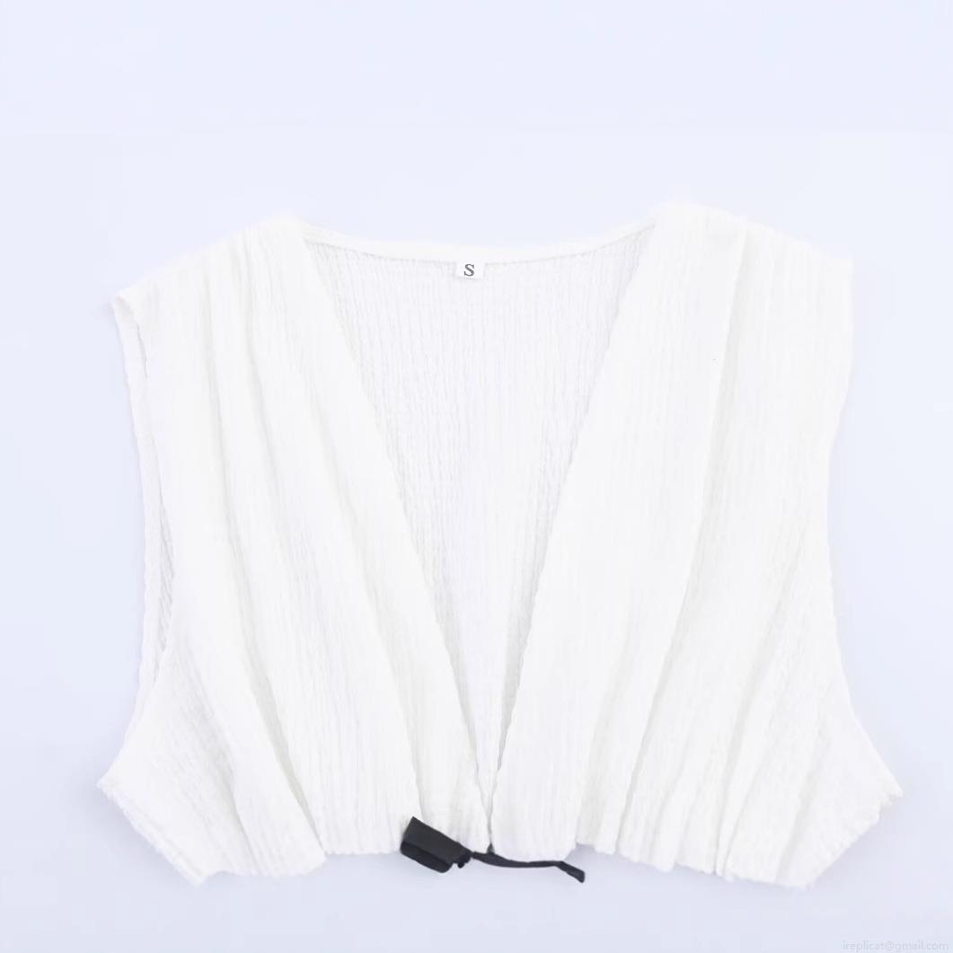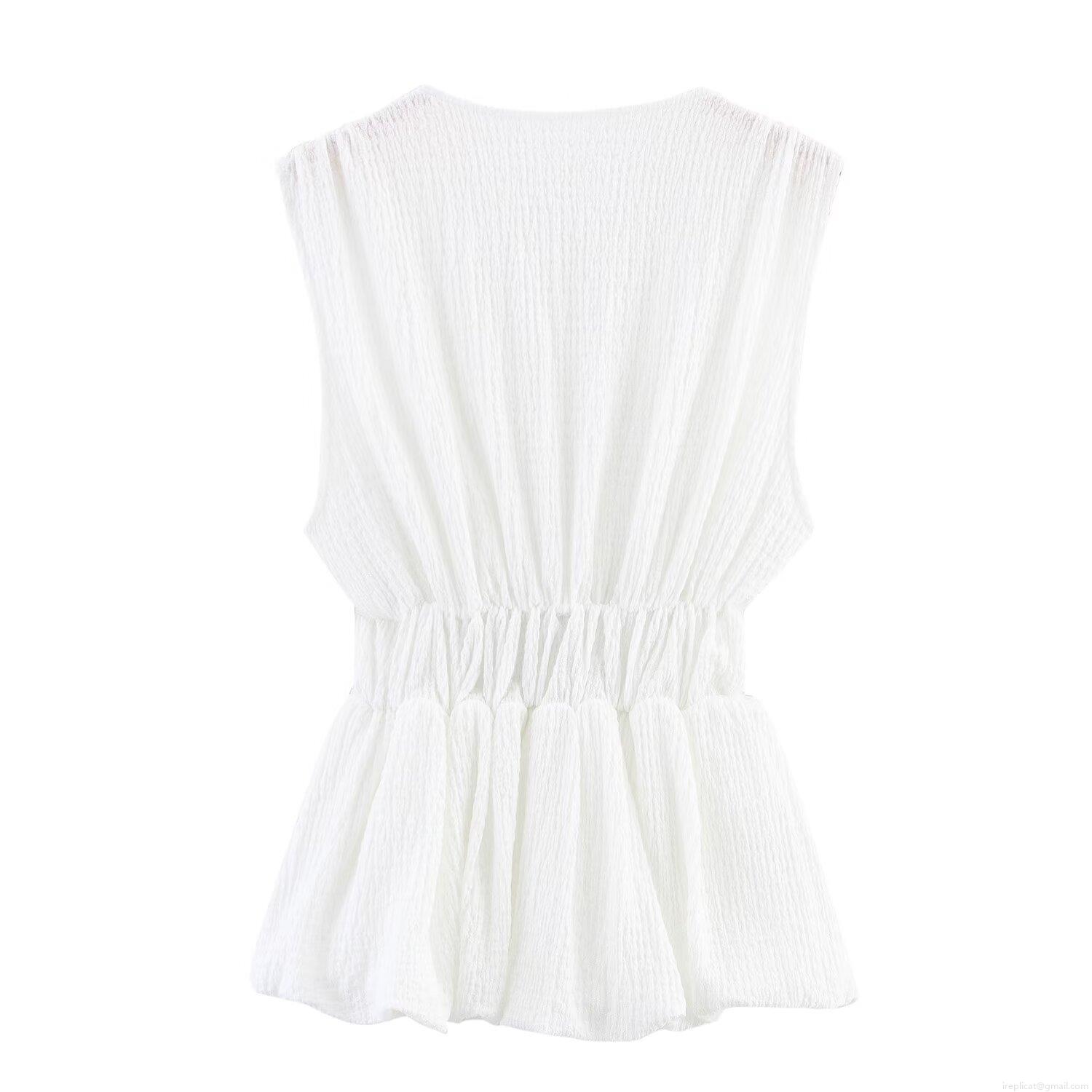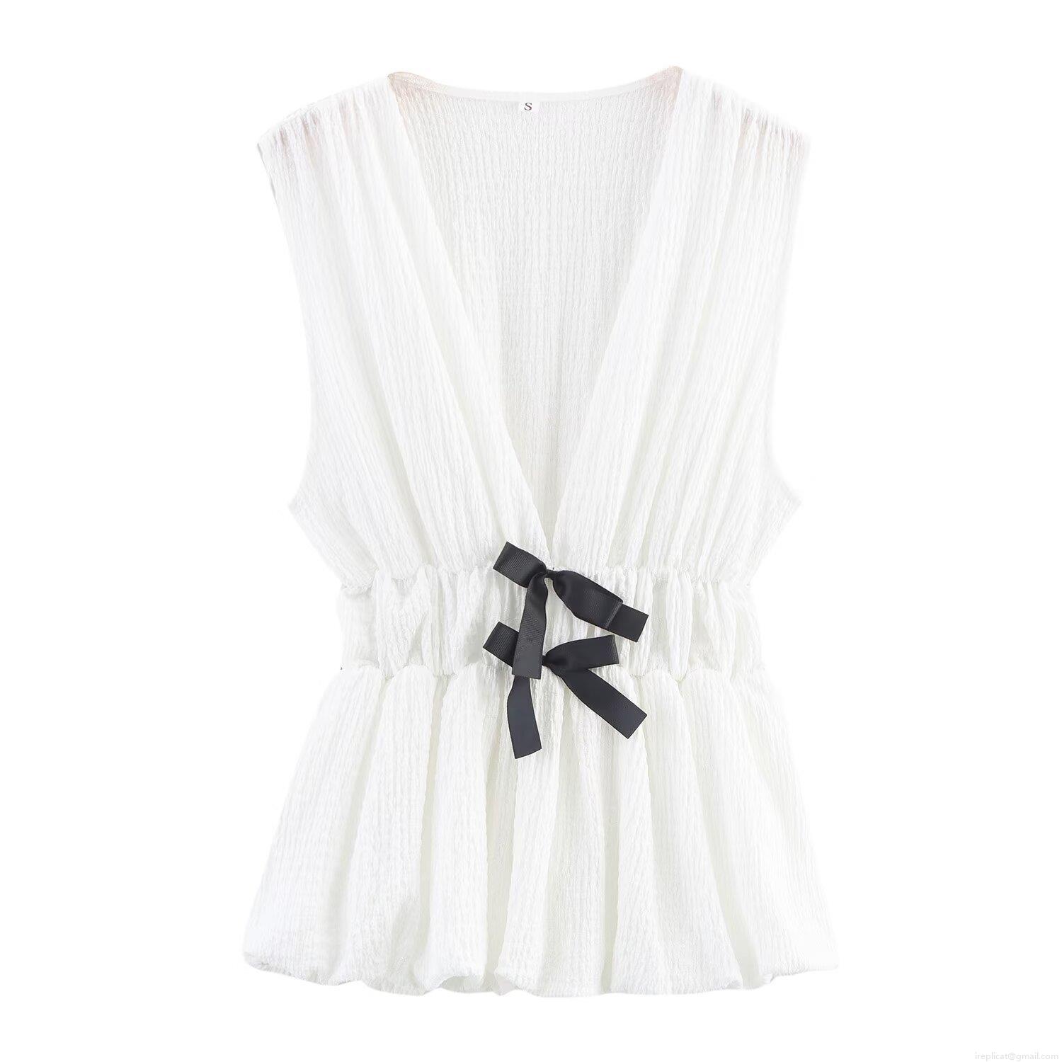 • Women's Sweet V-Neck Sleeveless Top With Black Bow Decor Textured Pleated Peplum Cami Slim Fit Polyester Cotton Blend Blouse For Date Party