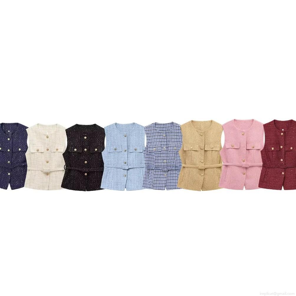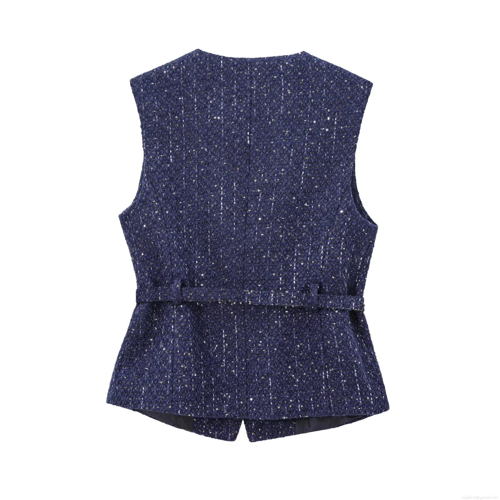 Women's Tweed Sequin Vest With Belt Sleeveless Round Neck Jacket Gold Button Lady Style Socialite Waistcoat Polyester Fashion Top