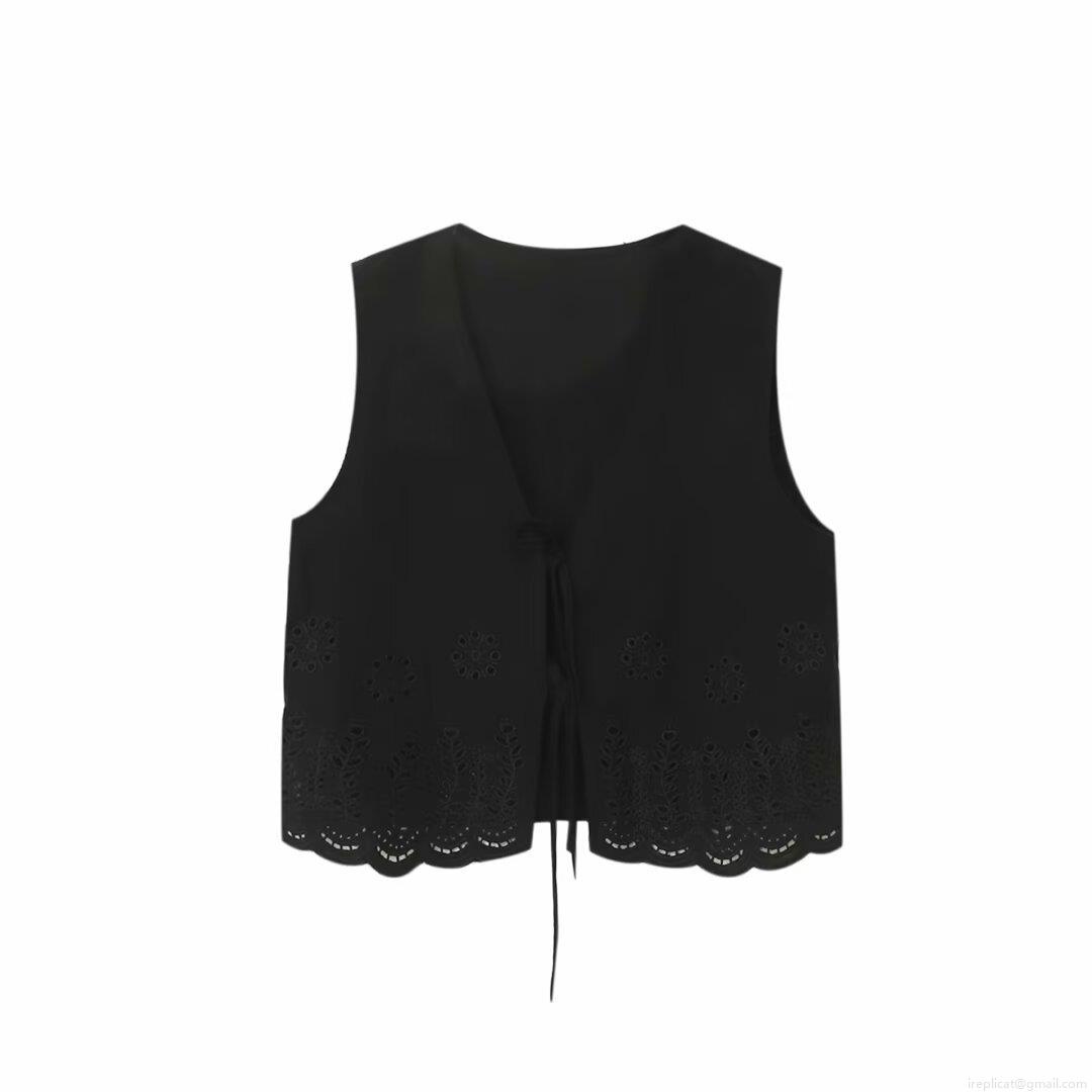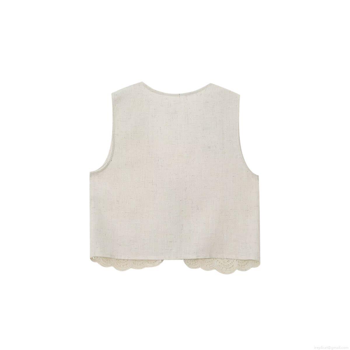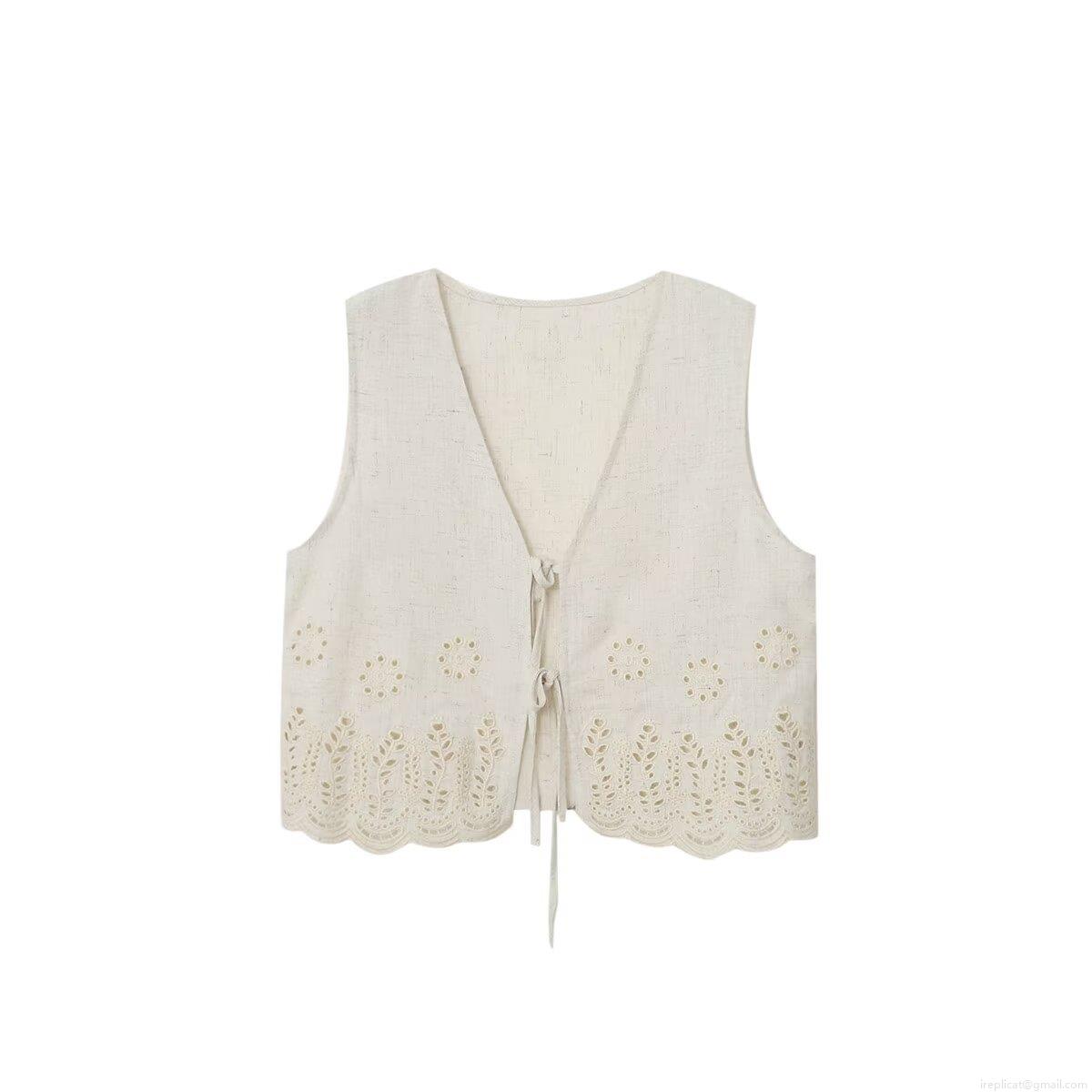 • Women's V Neck Sleeveless Vest Top Floral Hollow Out Embroidery Front Tie Up Scalloped Hem Cotton Linen Blend Texture Casual Streetwear Waistcoat