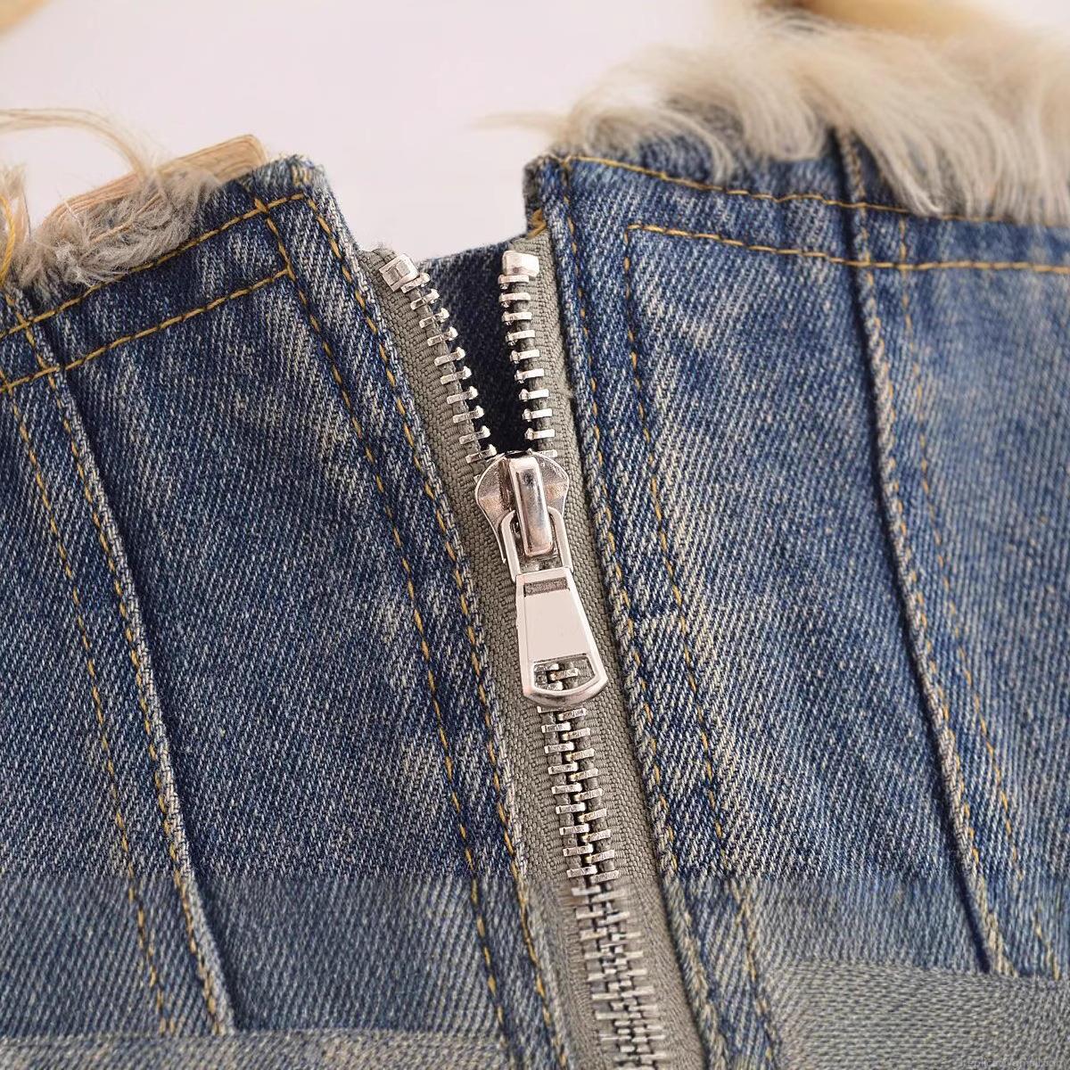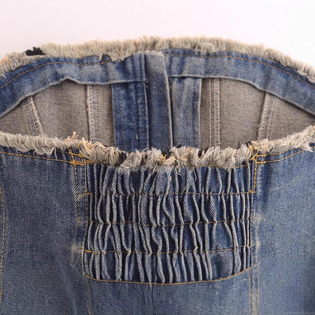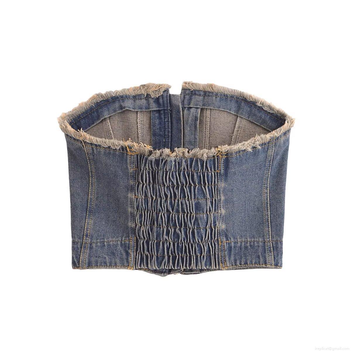 • Women's Vintage Distressed Denim Tube Top Fringed Raw Edge Sleeveless Crop Top With Zipper Front Smocked Back For Summer Streetwear