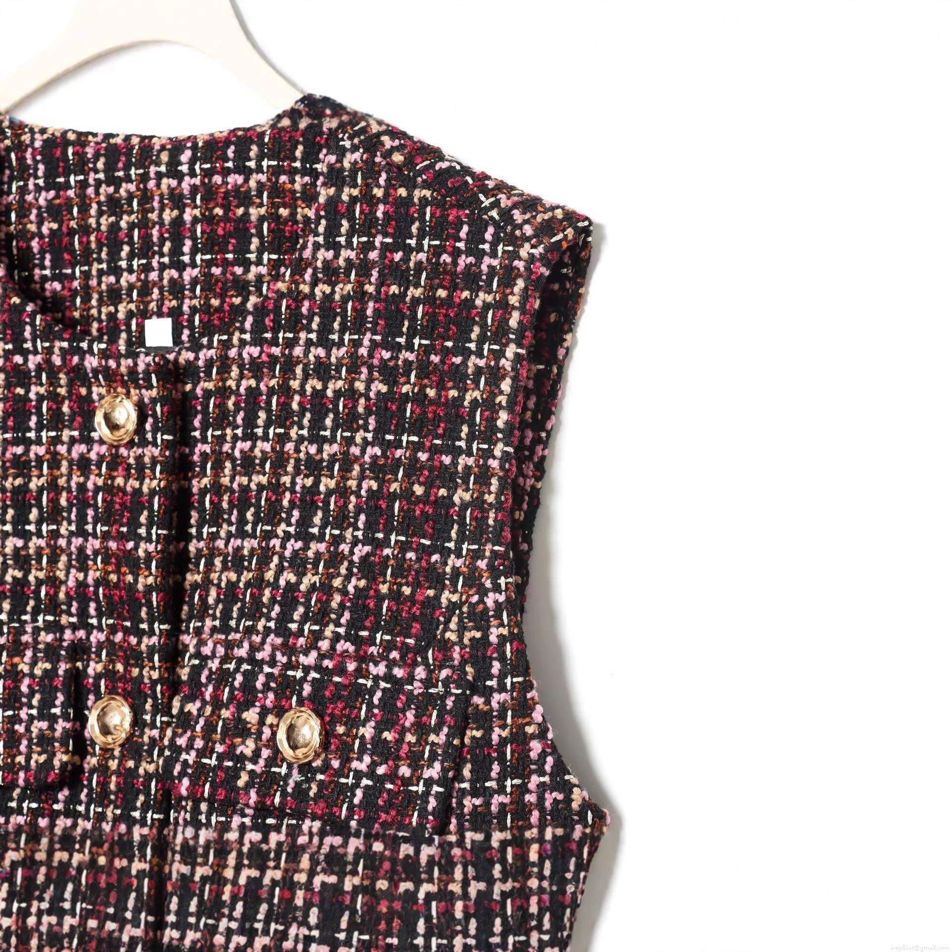 • Women's Vintage Tweed Vest Elegant Plaid Sleeveless Tank Top With Gold Buttons And Belt Classic Knit Outerwear For Office Party Casual Wear